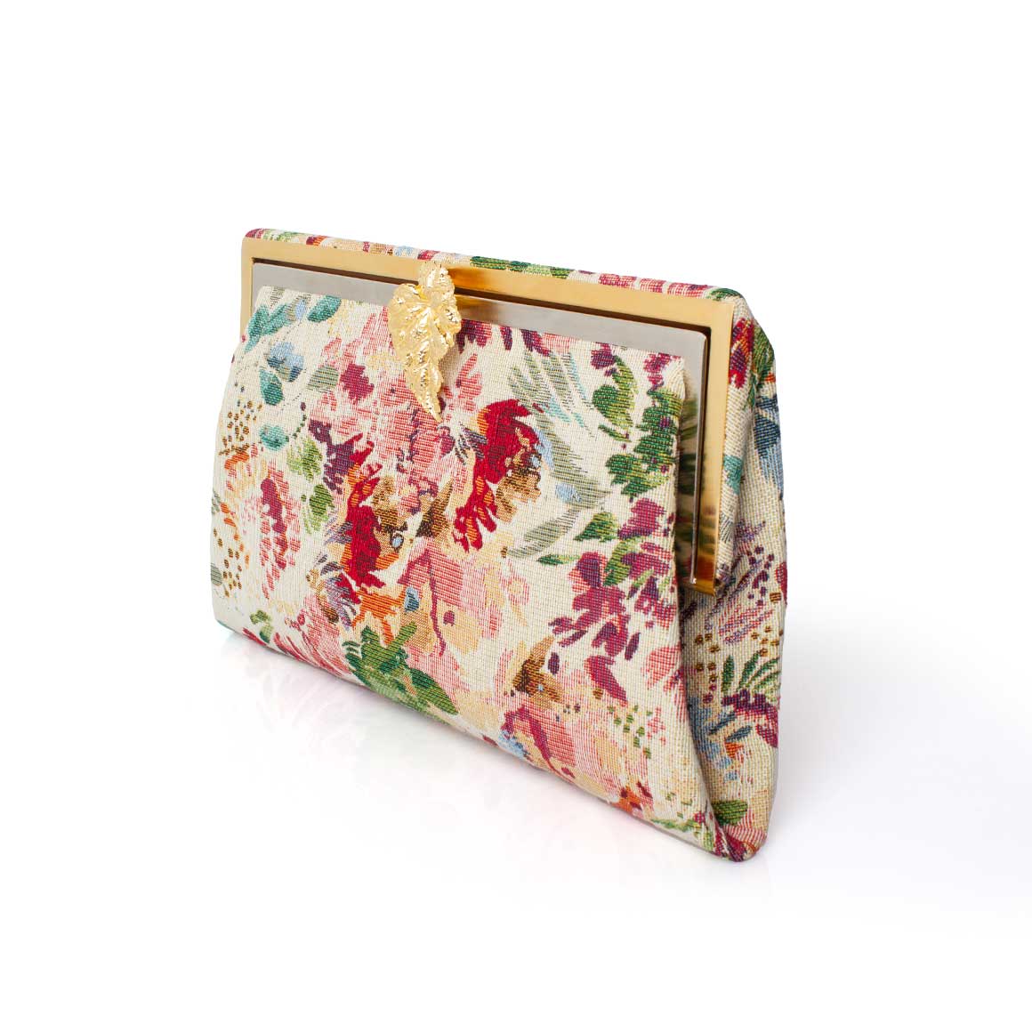 The Wildflower Leaf Grace is a structured handbag crafted in richly woven floral jacquard. Its angular silhouette is topped with a polished metal frame and finished with a gold-tone leaf clasp for a modern, tropical touch.