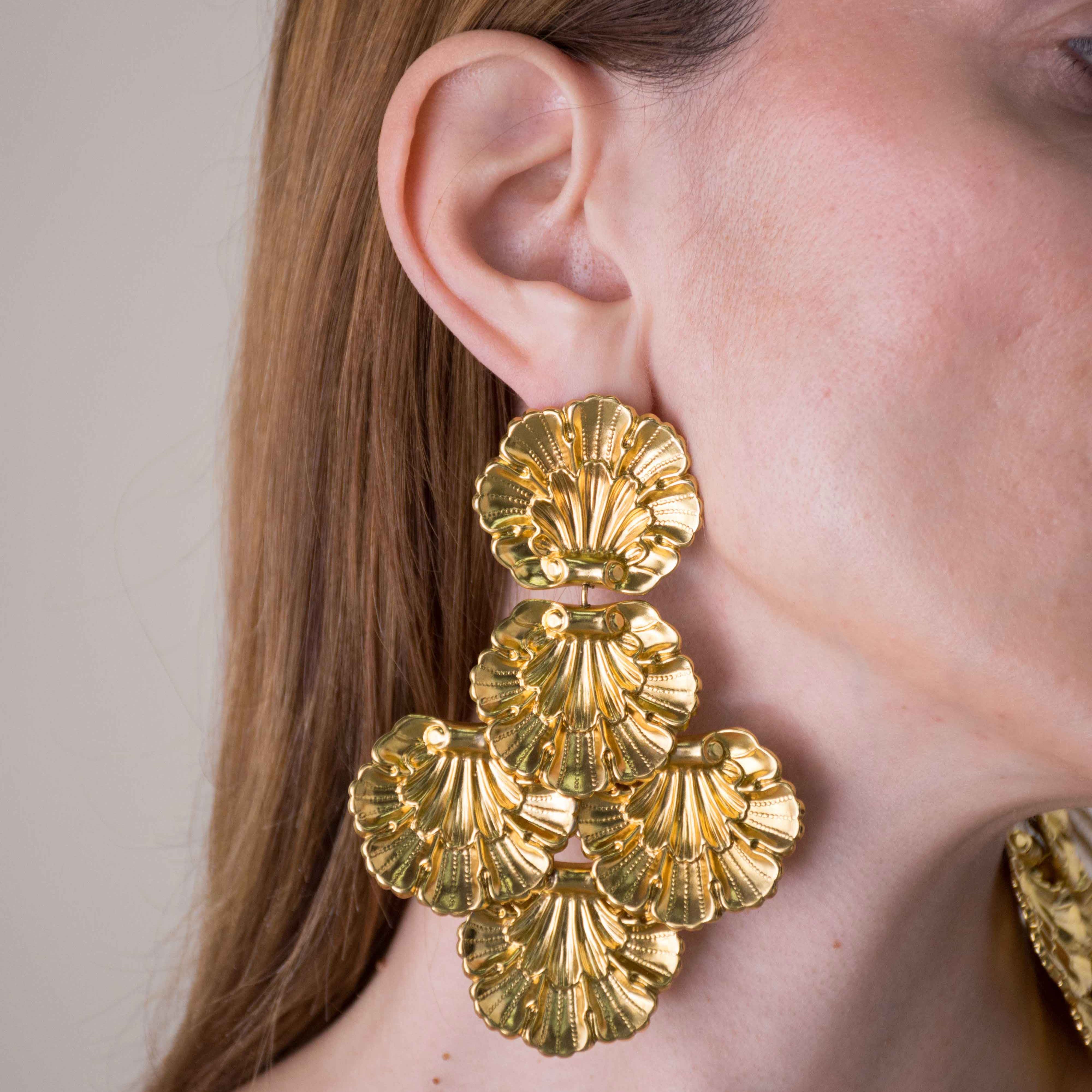 The Venus Big Earrings make a bold statement with their cascading arrangement of gold-toned shell forms. Sculptural and eye-catching, each earring features four fan-shaped shells linked together for dramatic movement and shine. Lightweight despite their size, they’re perfect for elevating evening looks or adding a touch of glamour to warm weather styling.