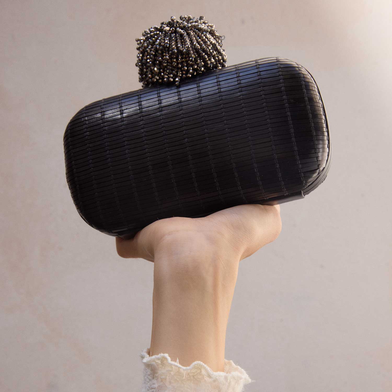 The Dhalia Crystal on Black Leather Box is a bold evening clutch. Crafted from glossy black leather with a grid-like finish, contrasted by a hand-worked crystal clasp shaped into a striking dahlia bloom. This statement accessory is part of The Grounded Collection, highlighting artisanal craftsmanship with a modern edge. Designed to be carried by hand, it adds depth and character to any refined occasion.