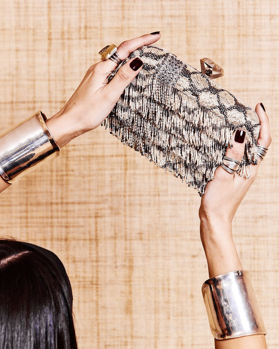 The Keffiyeh Shimmer Box, our bestseller since 2015. This versatile clutch seamlessly complements various occasions. Adorned with hand-beaded and embroidered details inspired by the traditional Arab Keffiyeh.