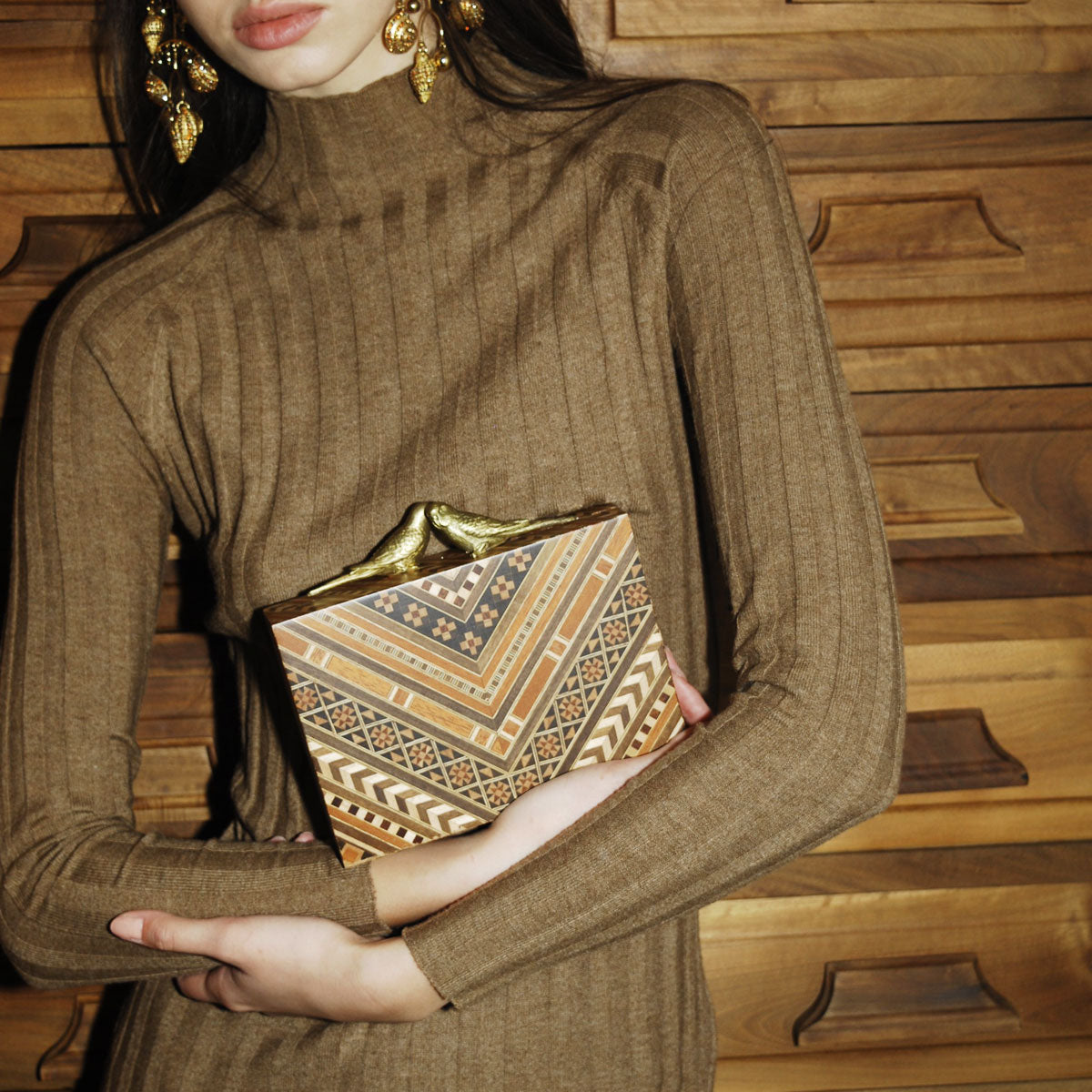 Uncover the allure of Lovers Marquetry wood bag, an exquisite fusion of classic craftsmanship and romantic symbolism. This stunning piece, crafted utilizing the centuries-old marquetry method, demonstrates the artistry of weaving various types of wood onto a wood veneer to make intricate mosaics and geometric designs. The clasp captures the essence of love, with two budgies beautifully held in a soft embrace. An optional shoulder chain allows freedom in styling, making it a perfect companion for any occasion.