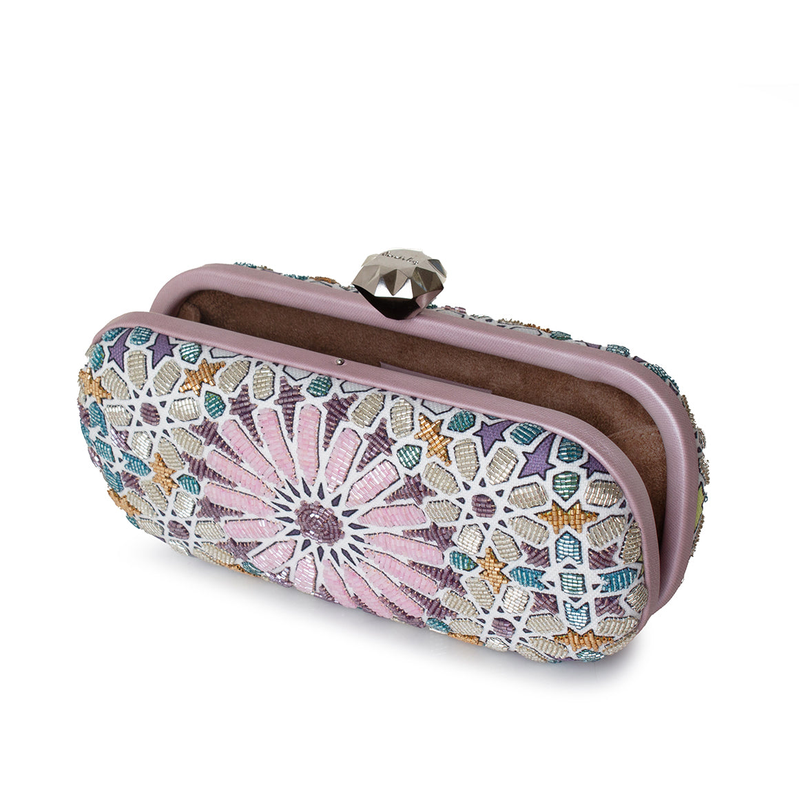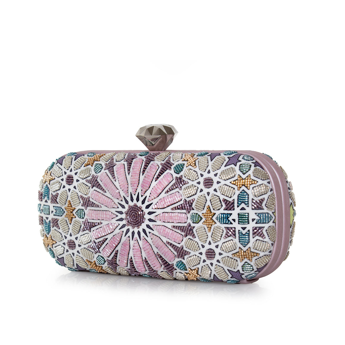 The Moroccan Pastel Big Box minaudière is a luxurious tribute to Moroccan Zellij mosaic artistry, seamlessly blending cultural heritage with contemporary elegance. Intricately hand-embellished with glass beads in a serene palette of pastel pink, blue, and metallic hues, this compact clutch adds a luminous accent to any outfit. Its sleek box shape fits comfortably in hand, making it the perfect statement piece for special occasions and evening glamour. This gleaming minaudière is finished with a diamond-shaped push clasp and is designed to hold your evening essentials. A timeless addition to any collection, the Moroccan Pastel Big Box enhances both understated and bold ensembles, season after season.