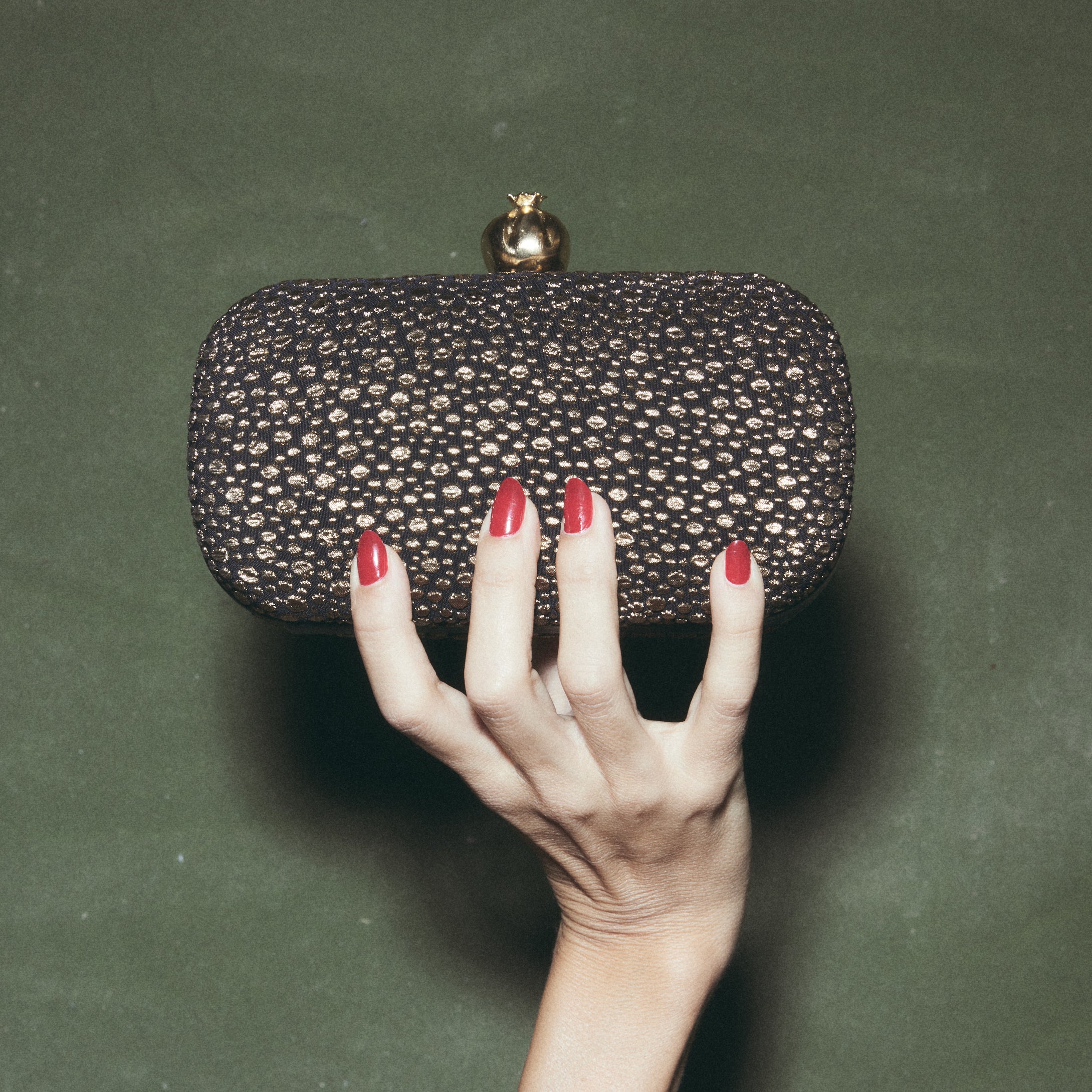 Pomegranate on Morning Dew Box is a minaudière that exudes opulence and sophistication. Its delicately embossed body resembles golden dew drops against a sleek black background. The clutch is crowned with a golden pomegranate clasp, a timeless symbol of beauty and prosperity, creating an exquisite focal point for this standout piece. Whether paired with a minimalist gown or a bold, glamorous look, this clutch adds a striking touch of refinement to any edit. Shaped to fit perfectly in hand, it holds all your evening essentials.