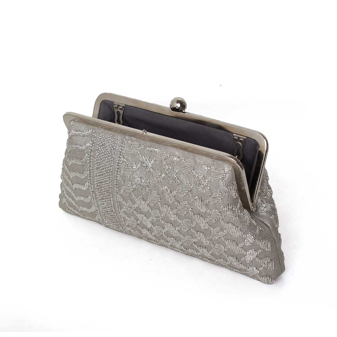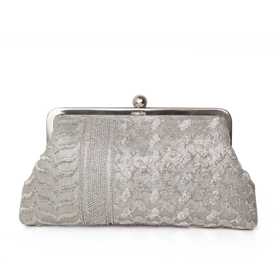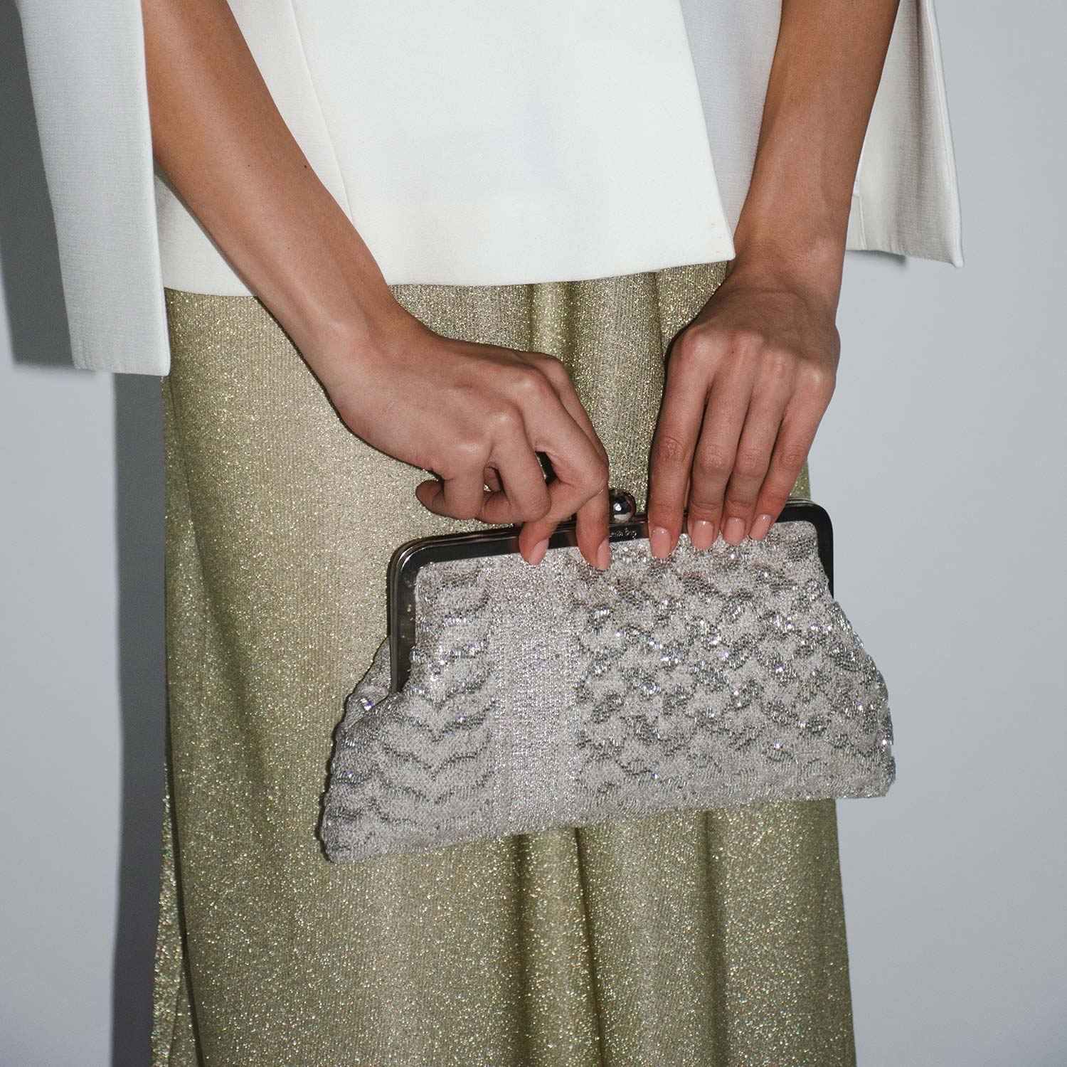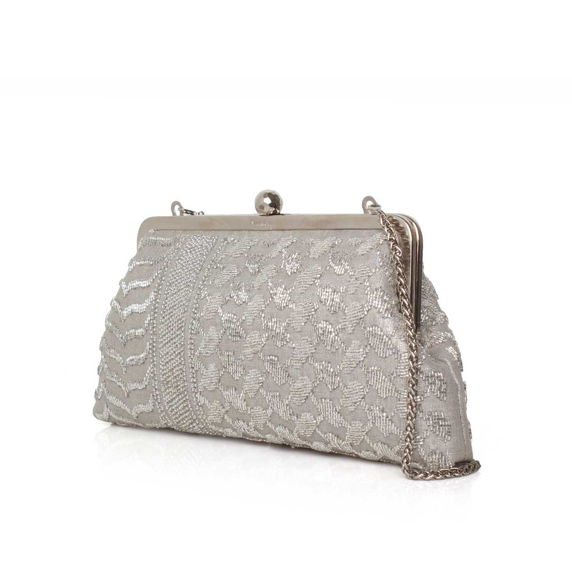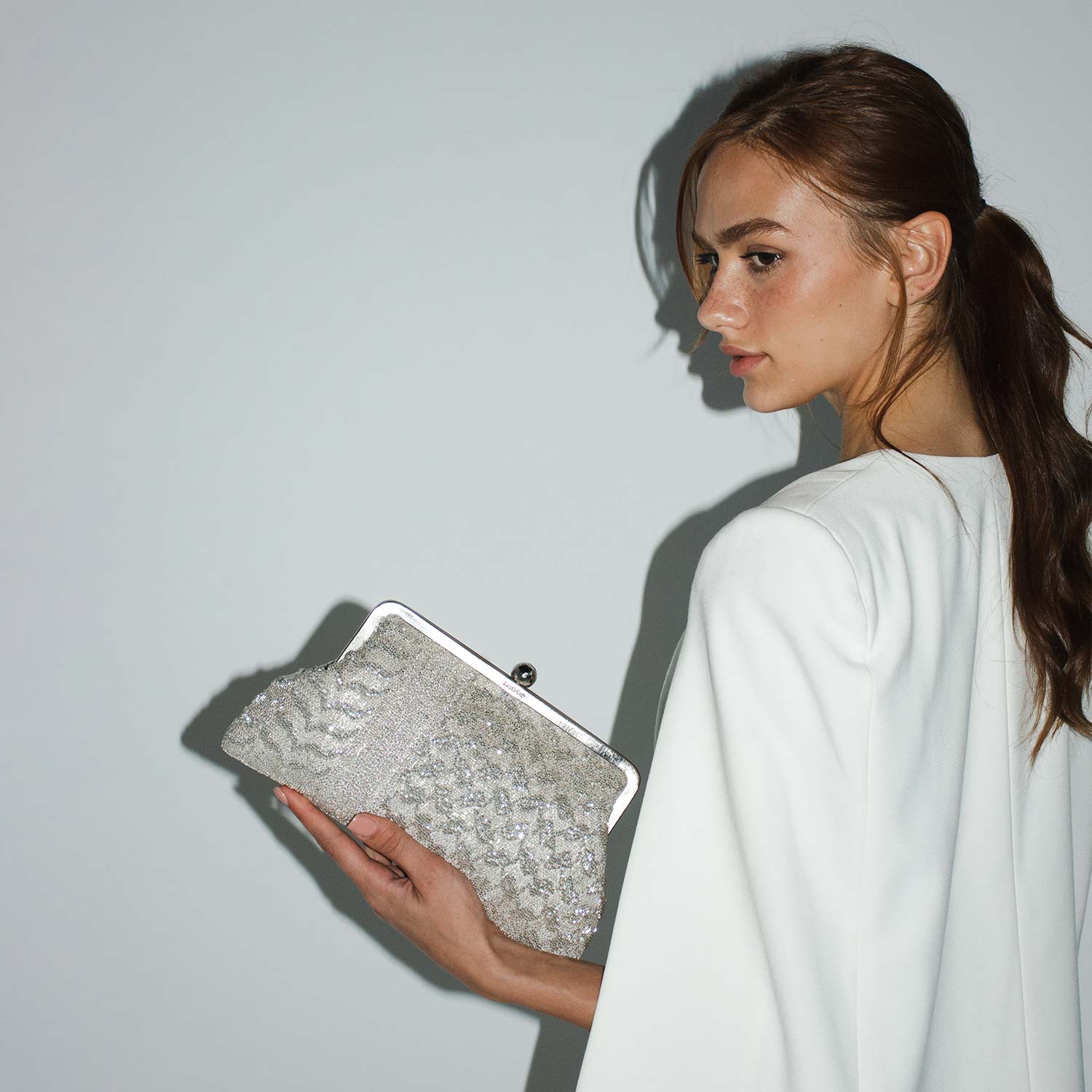 The Keffiyeh Silver Classic, where the delicate hand-beaded and embroidered decorations resemble the classic Arab Keffiyeh design. Wear it as a clutch or gracefully draped over the shoulder with the included chain.