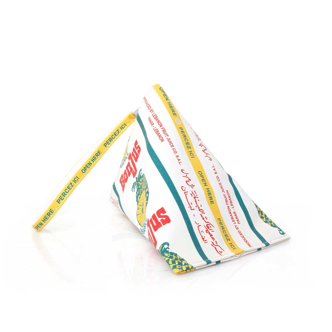 We took a sweet trip down memory lane and indulged our childhood nostalgia by re-creating triangle-shaped Bonjus cartons into zippered purses with hyper-realistic prints. You can slip it on to your hand as a playful statement bag or simply a great conversation starter!