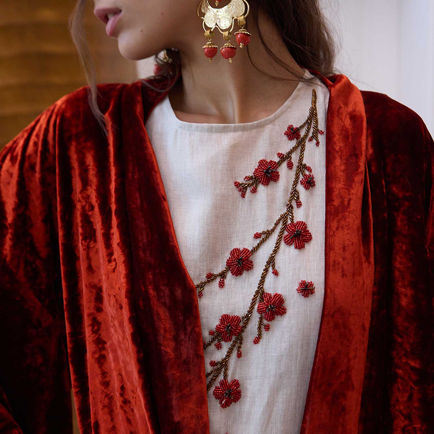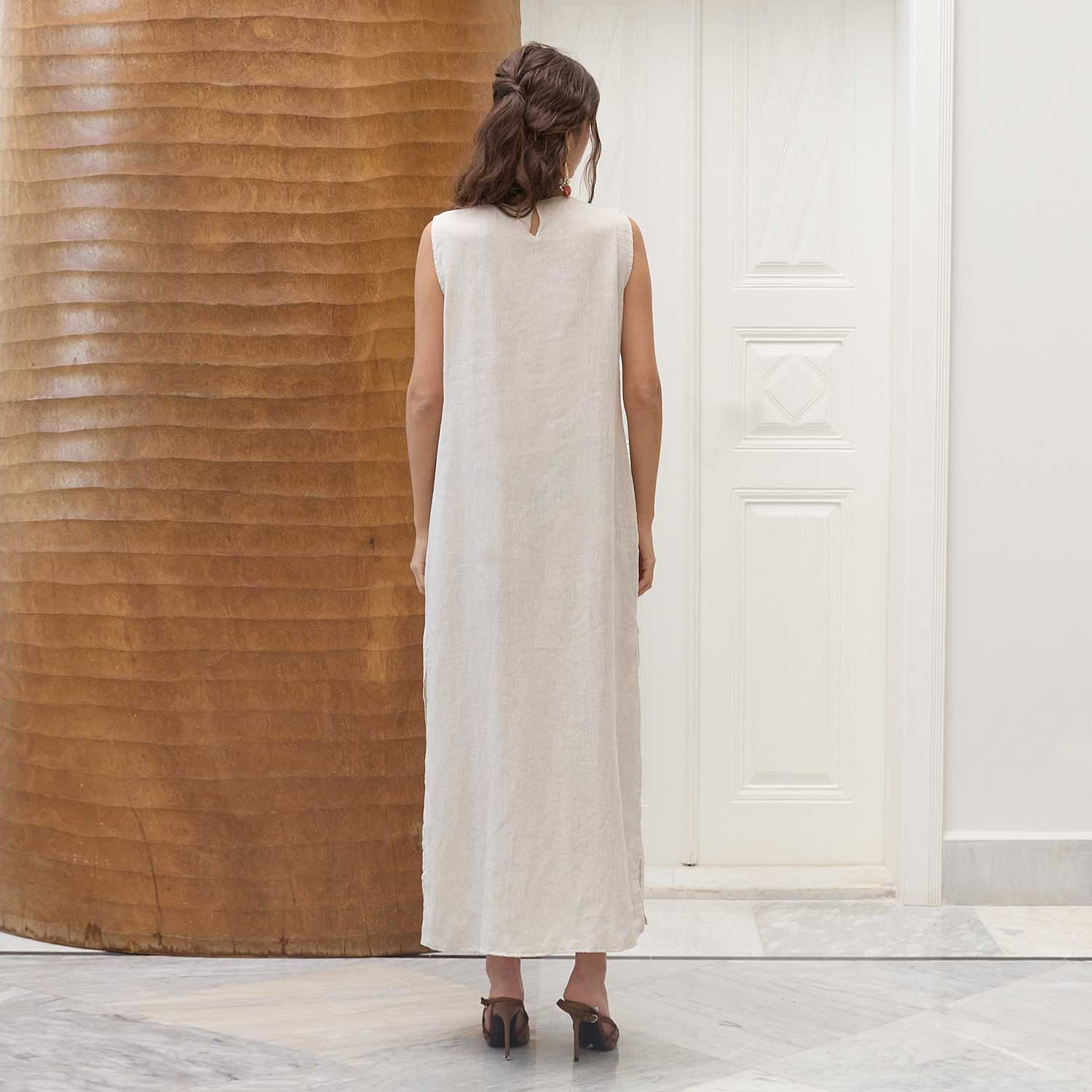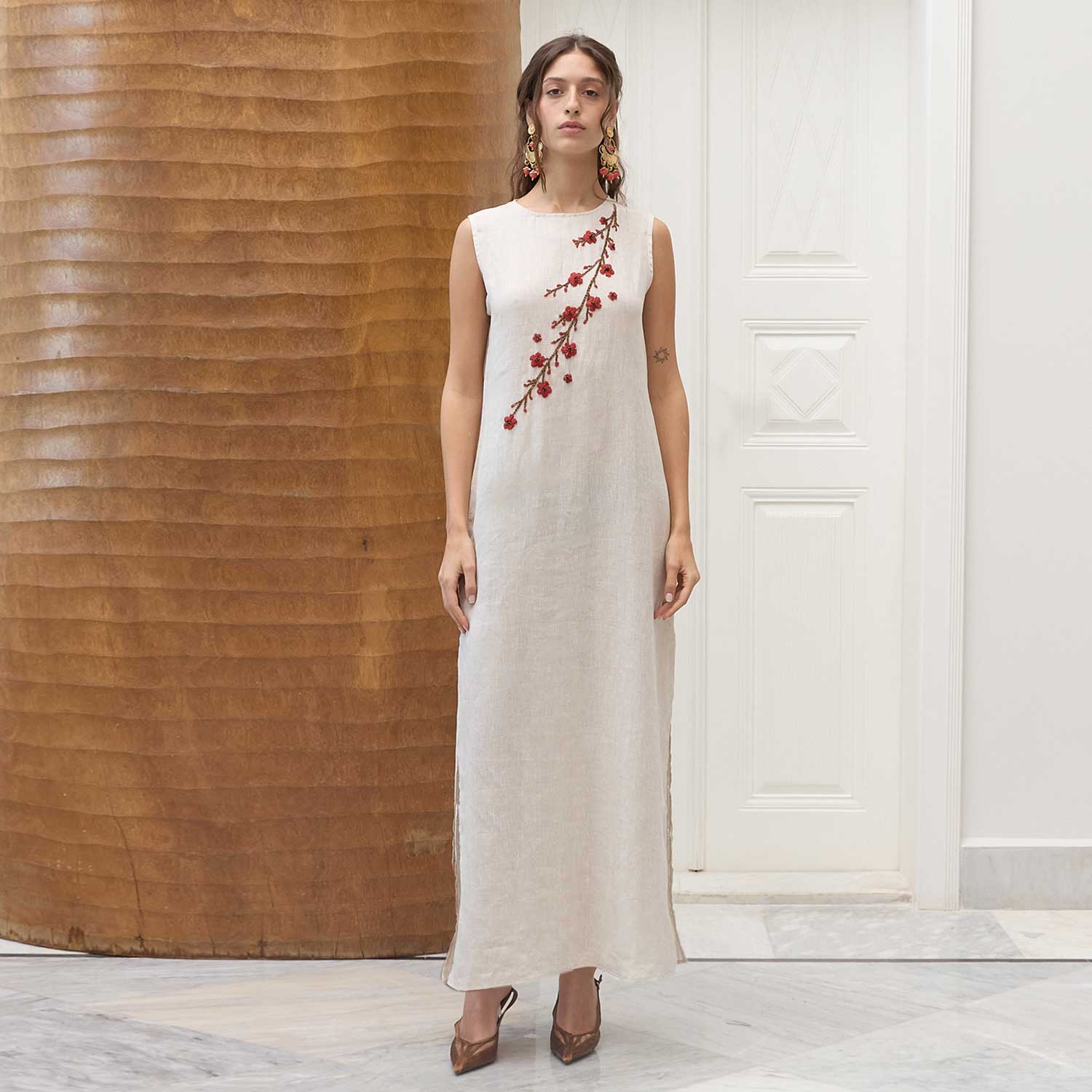 Ruby Blossom on Beige Vanda Dress is defined by its understated lines and thoughtful detailing. Hand-beaded flowers run diagonally across the front, each bloom individually placed to create subtle texture and depth. The sleeveless, straight cut falls fluidly in lightweight beige fabric, offering comfort and ease of movement. Designed with a clean finish and minimal structure, it transitions seamlessly from day to evening with simple styling.