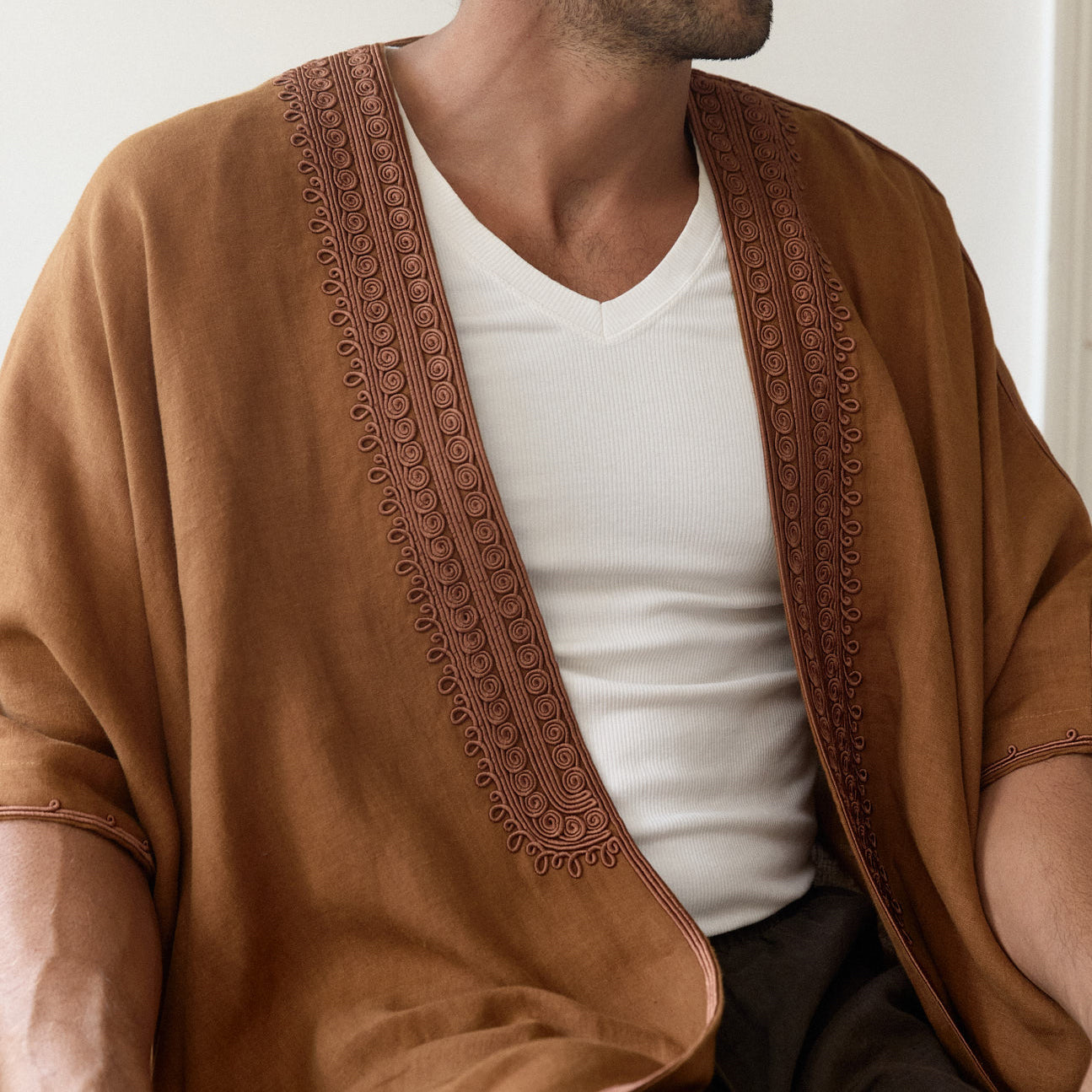 The Men’s Brown Linen Abaya fuses comfort with craftsmanship. Its lightweight linen fabric offers a breathable, cooling feel, perfect for relaxed gatherings. Traditional silk embroidery traces the neckline and chest with quiet precision, while the design, inspired by the Lebanese abaya, embodies effortless sophistication for any easy, refined occasion.