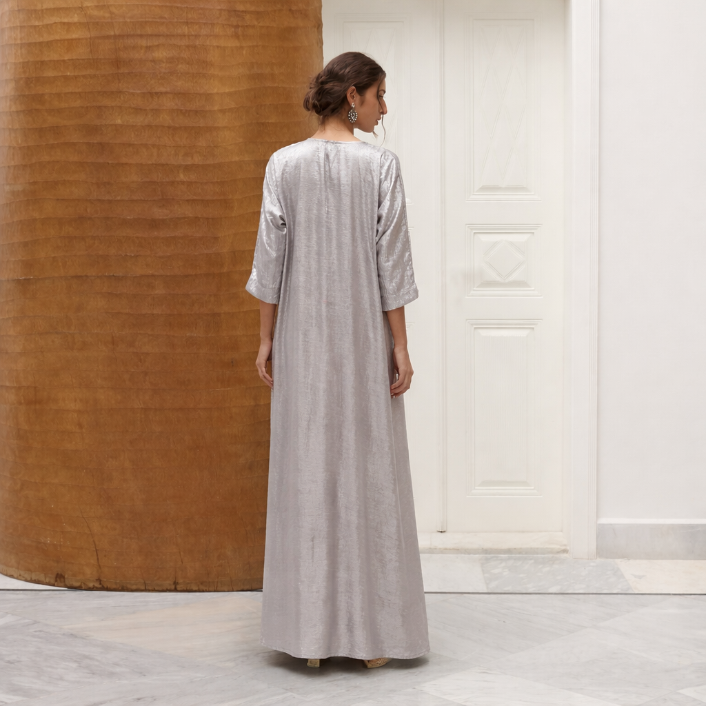 A softly structured dress in shimmering silver fabric, designed with an oversized cut and a fluid, easy drape. A hand-beaded sun motif in silver tones highlights the neckline, while delicate beadwork continues down the front for subtle detail. Finished with three-quarter sleeves and a clean finish, the Rising Sun on Silver Ayla Dress works effortlessly from day to evening with minimal styling.