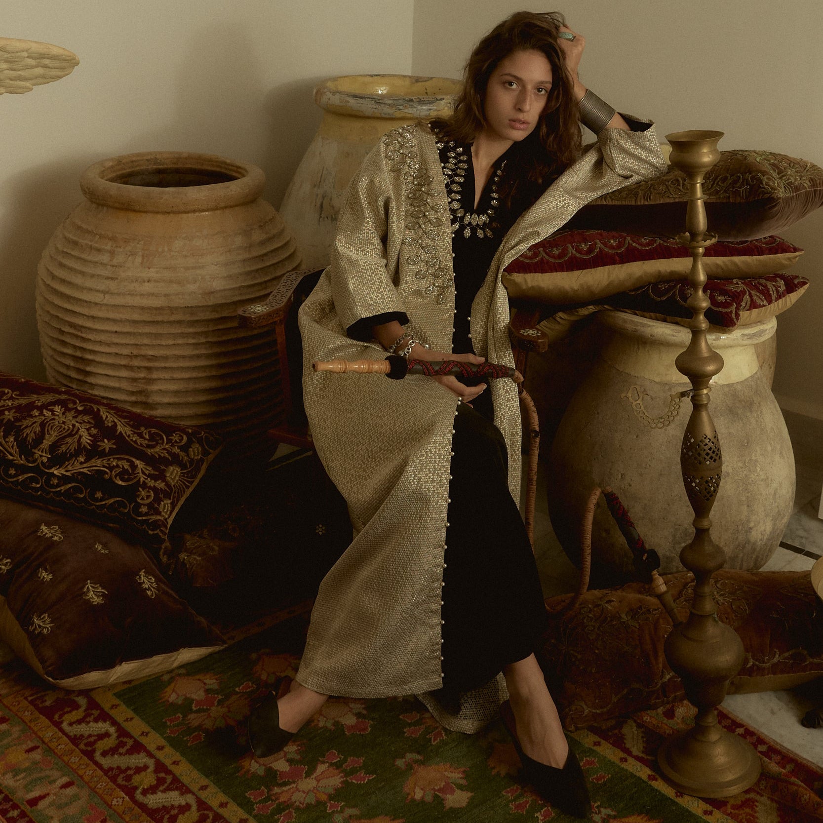 Light catches softly on the textured honeycomb fabric, giving this piece depth without weight. Petals on Honeycomb Abaya is detailed with hand-applied floral embellishments along the neckline and shoulders, where layered sequins and beads are arranged into subtle blooms that add texture and dimension. The open front and fluid cut make it easy to layer over dresses or style on its own, offering a refined option for evening gatherings and special occasions.