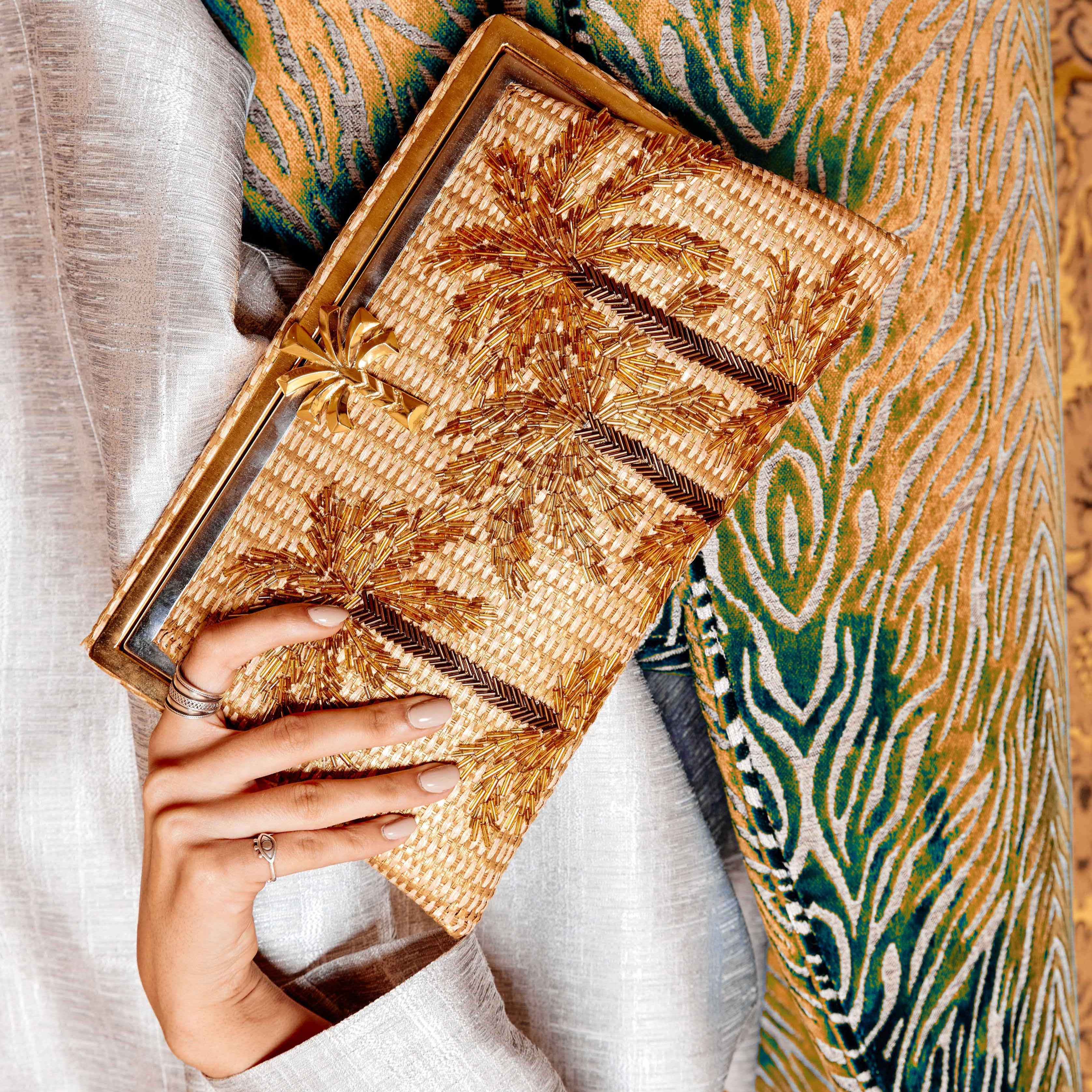 The Golden Oasis Straw Grace is an exquisite accessory that radiates timeless elegance. Meticulously hand-beaded with glass beads, it captures the essence and deep symbolism of the strong and generous palm tree. Set upon a golden straw base, its allure is further enhanced by a palm tree-shaped clasp, allowing for easy access with a simple rotation.