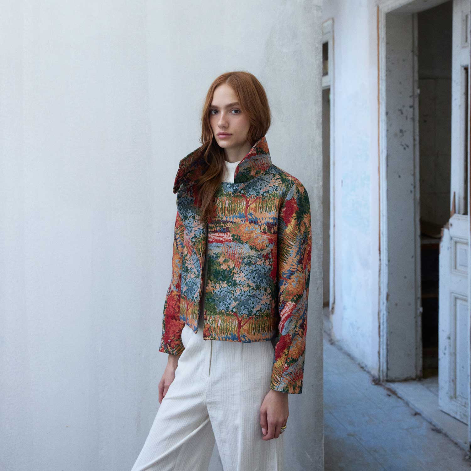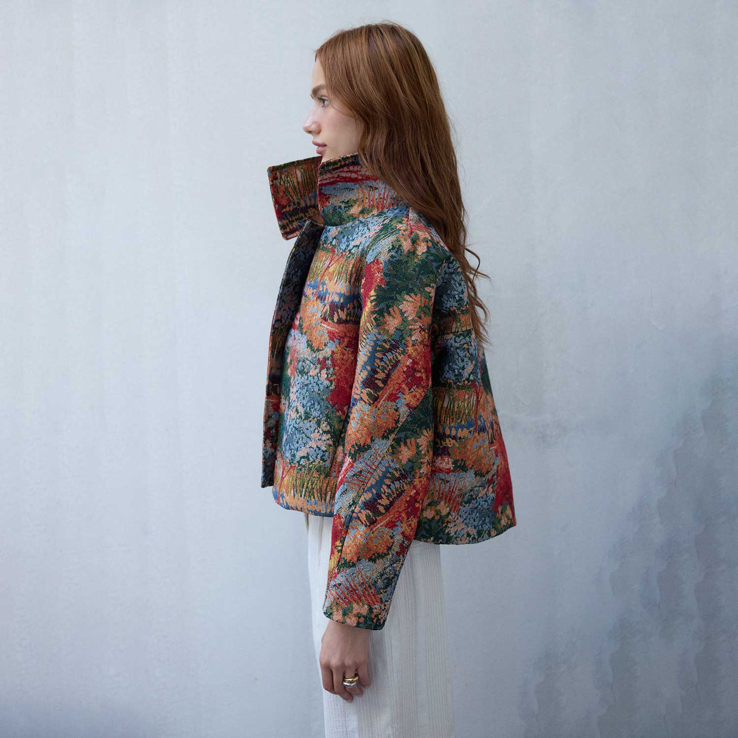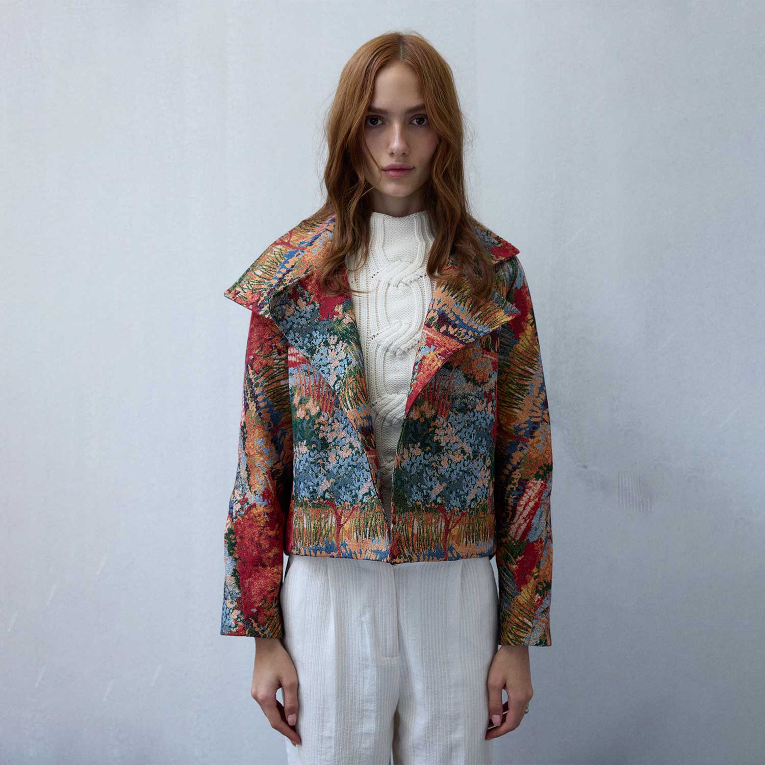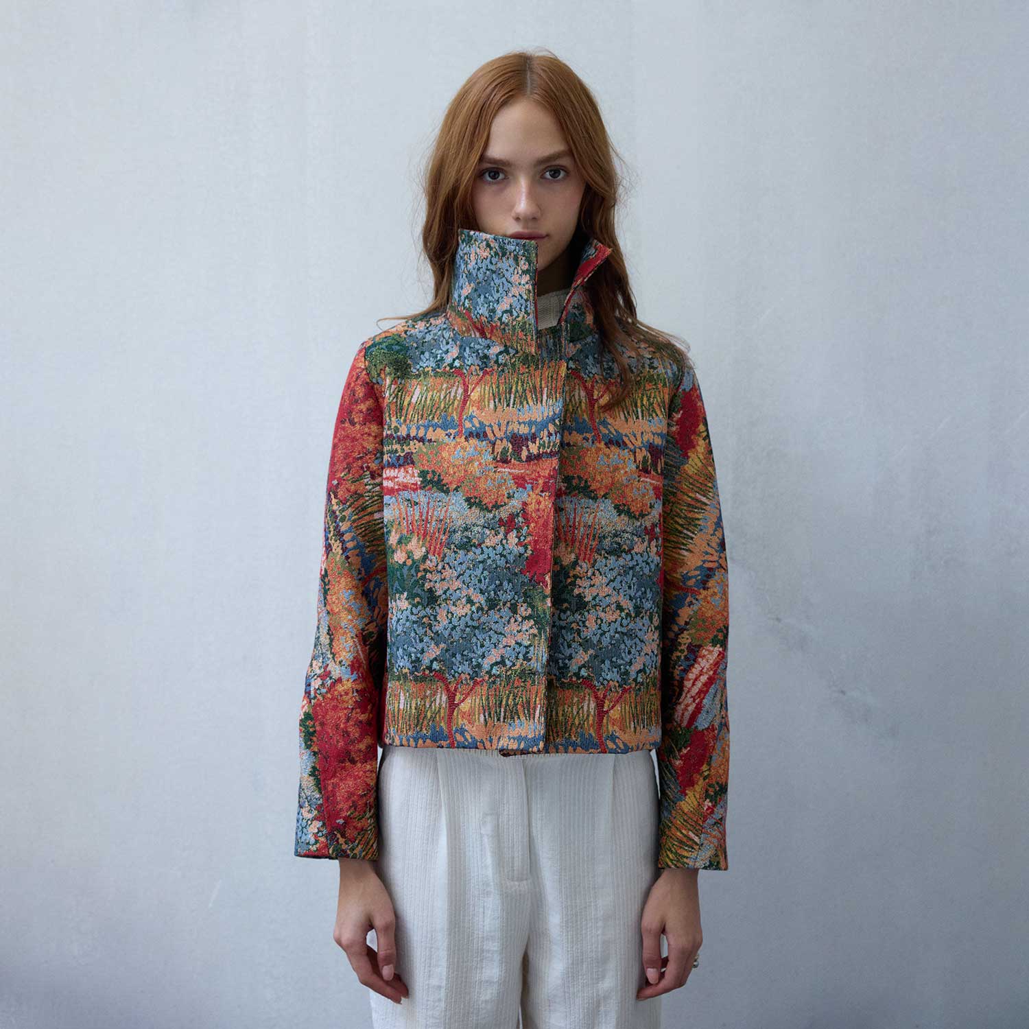 The Autumn Field on Yas Jacket is woven in jacquard and patterned with a tapestry of warm autumnal tones. Its structured silhouette, notched collar, and front closure give definition, while the fabric’s mid-weight texture makes it ideal for layering in transitional months. A statement piece from The Grounded Collection, it captures the depth and richness of fall, designed to bring warmth and artistry to everyday autumn wear.