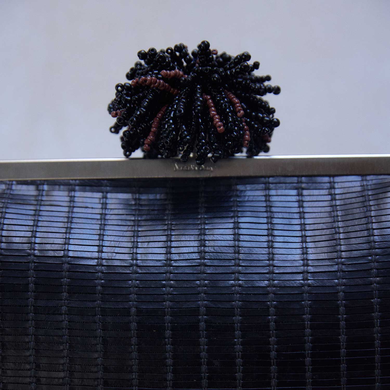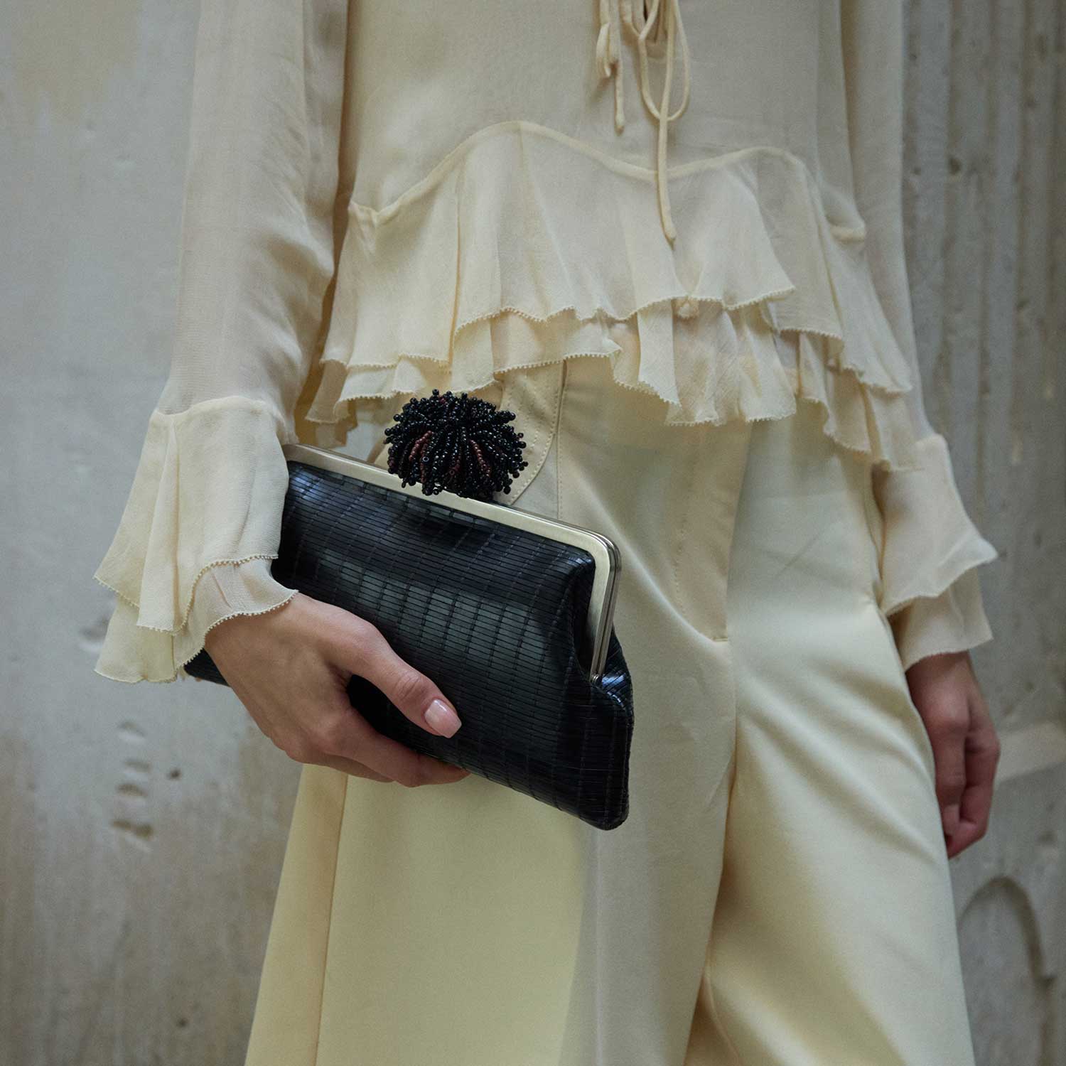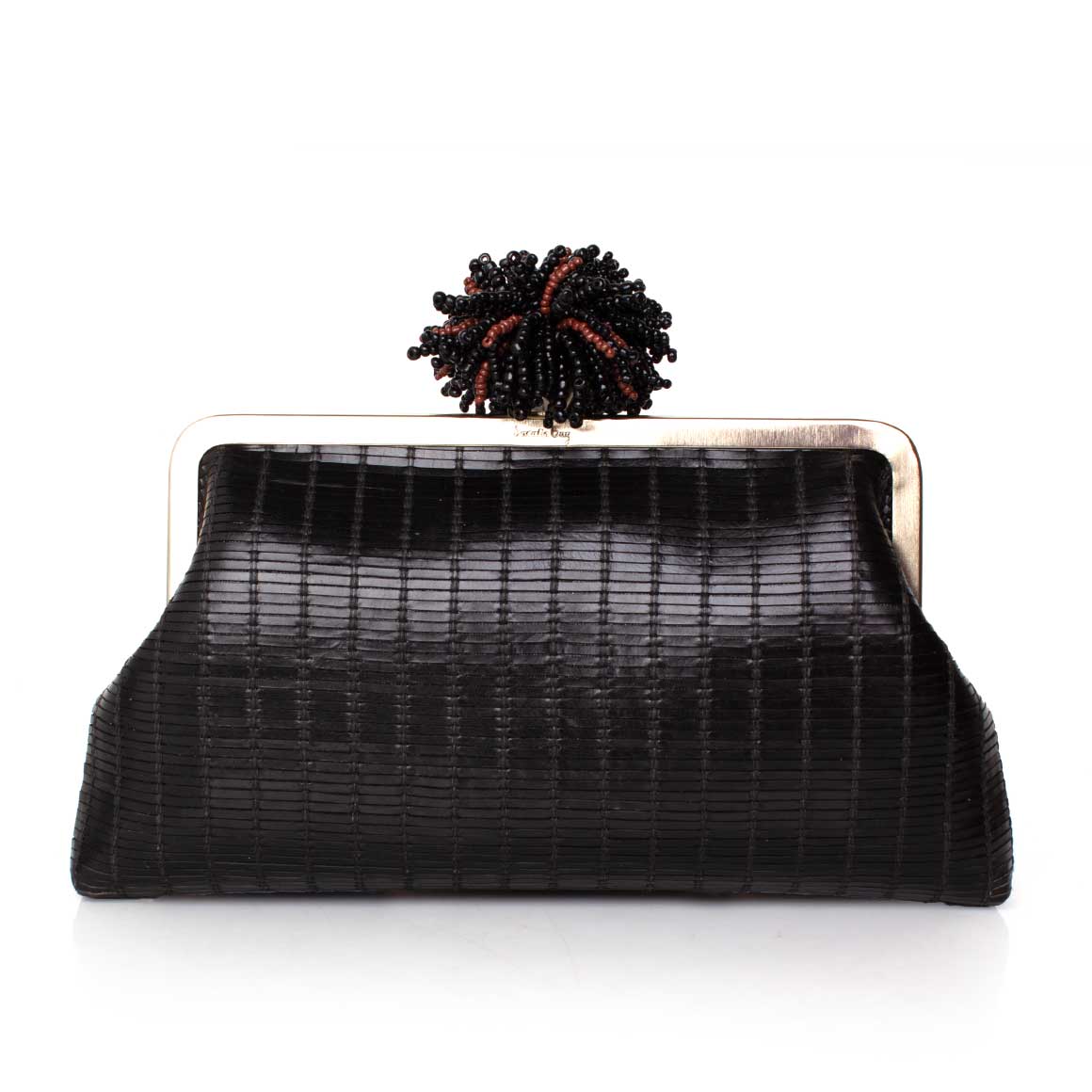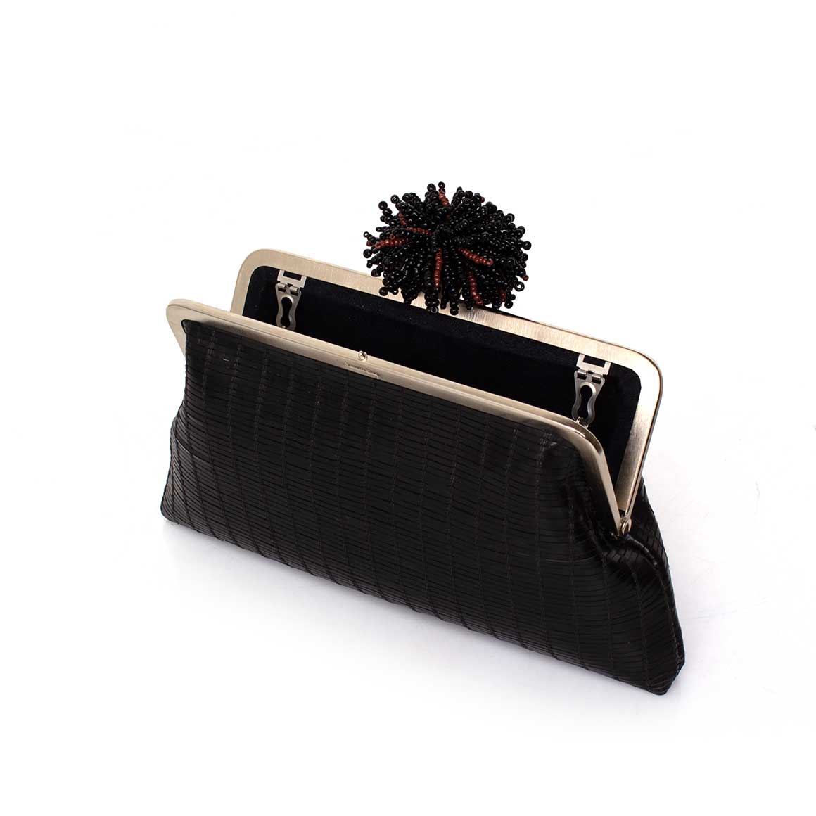 The Dhalia on Black Leather Classic Bag from The Grounded Collection. Crafted in textured black leather, it’s crowned with a sculptural beaded clasp inspired by the dahlia flower, detailed with black and deep red beads. Designed with a detachable chain, it can be carried by hand or worn on the shoulder, offering versatile styling for day or evening occasions.