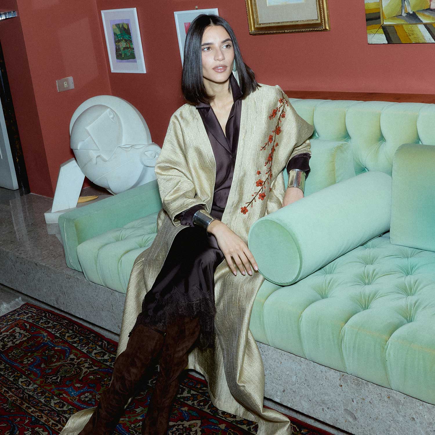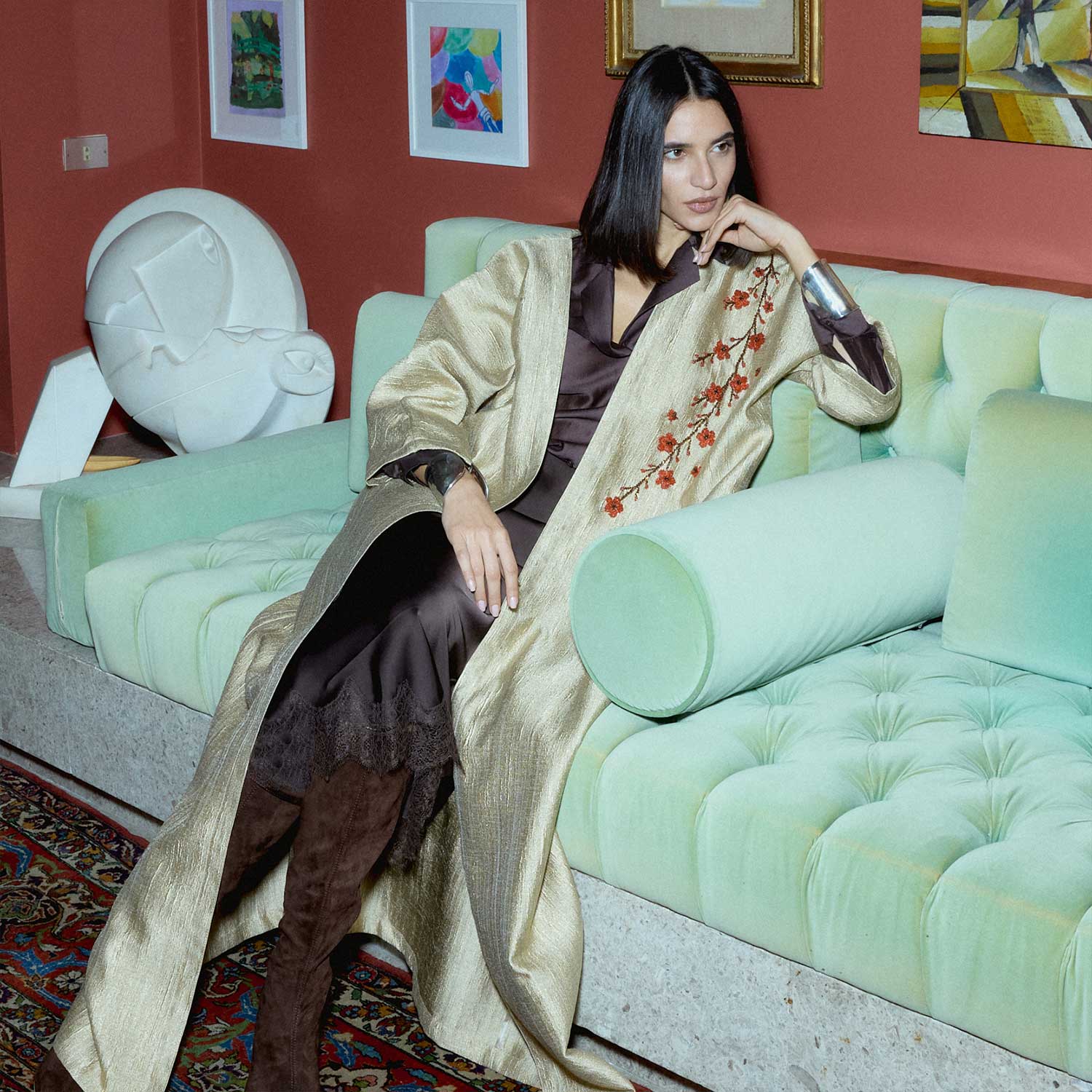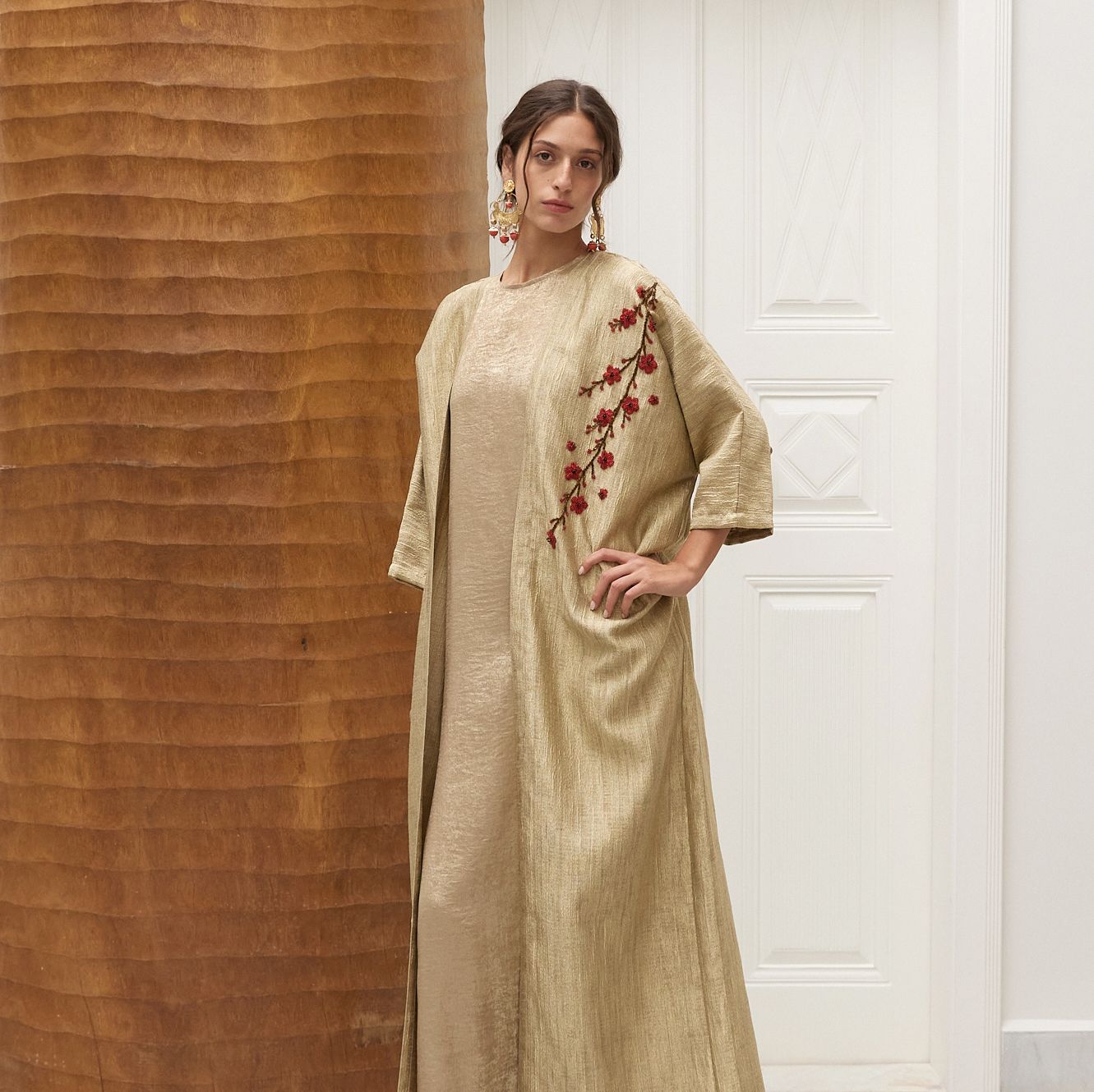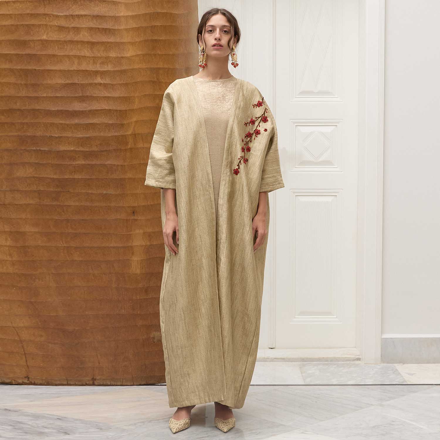 An elegant balance of ease and detail, the Ruby Blossom on Gold Abaya is defined by its fluid drape and refined finish. The design is accented with delicate beaded flowers arranged along the shoulder, where fine beads are carefully applied to create subtle texture and dimension. The relaxed, elongated cut allows for natural movement, while the clean lines keep the look polished and understated. A versatile piece suited for both day and evening wear, styled simply over soft layers.