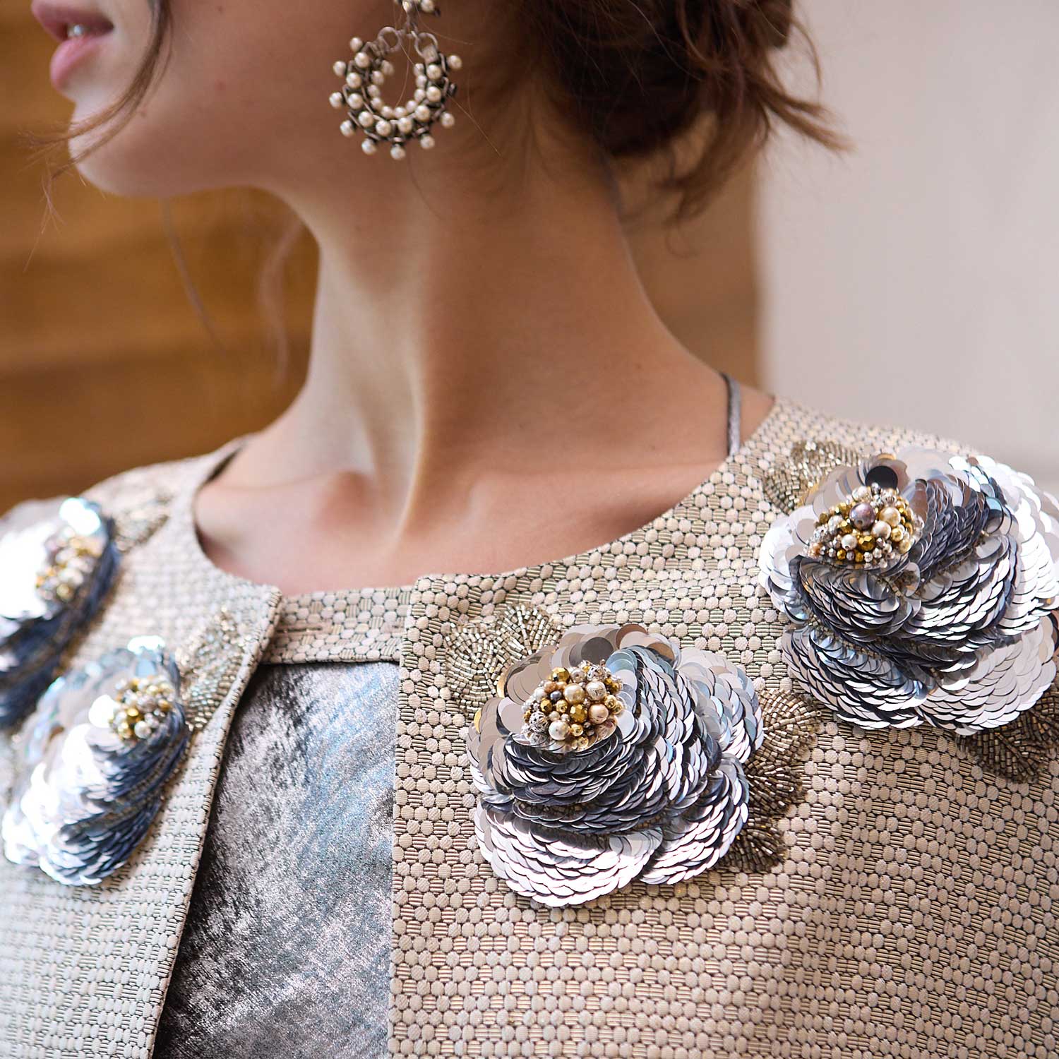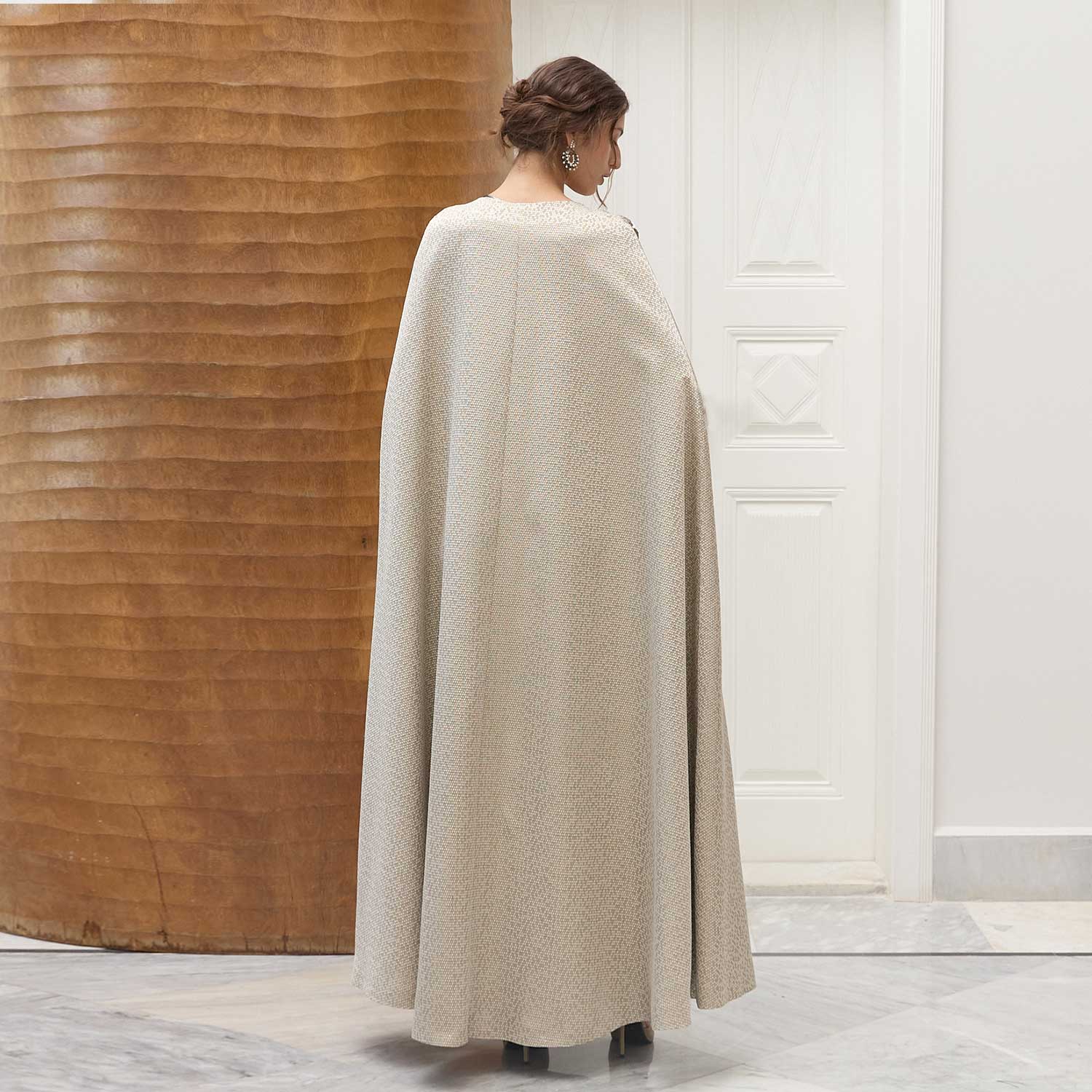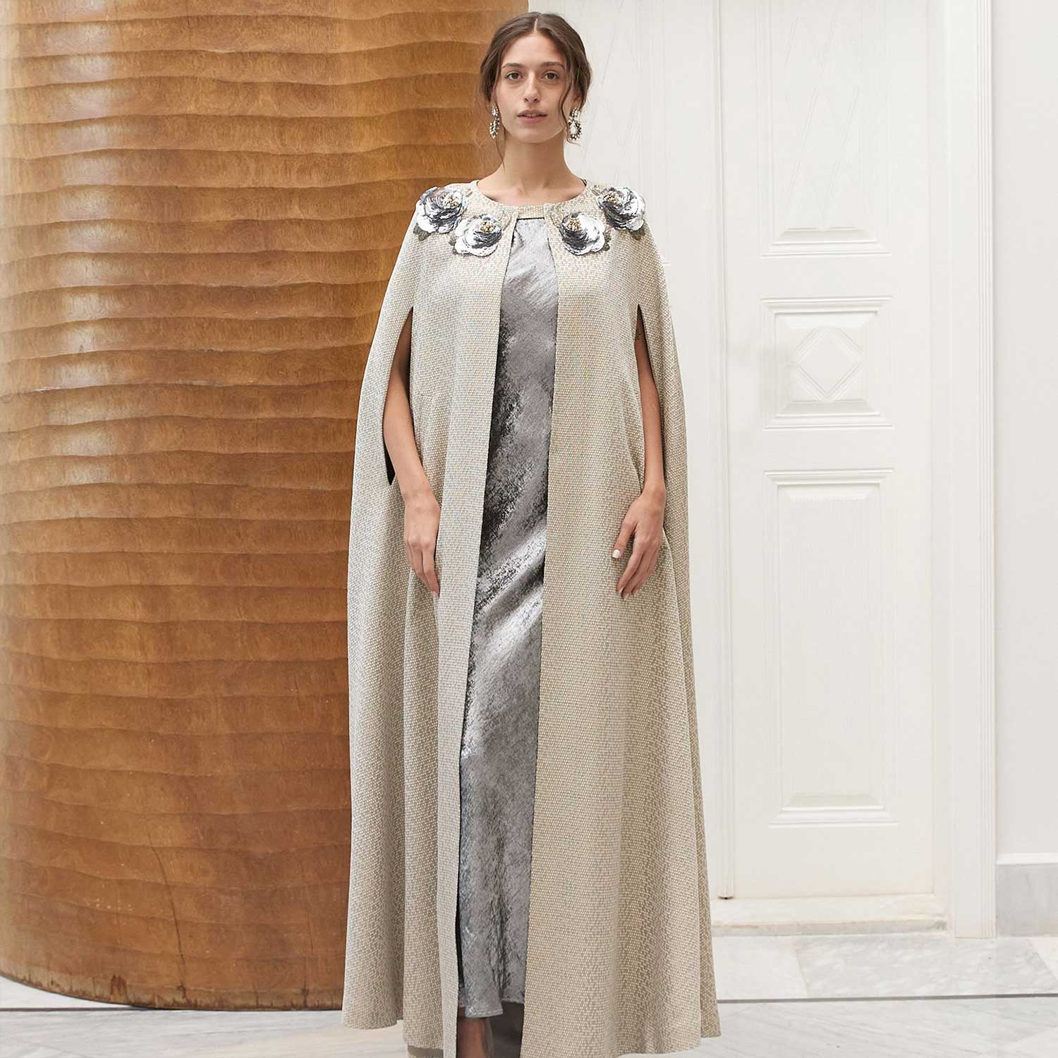 Soft honeycomb-textured fabric in a warm neutral tone defines this statement cape, designed to layer effortlessly over evening looks. Silver Flora on Honeycomb Imperial Cape is accented at the shoulders with floral embellishments, where layered silver sequins and beads are arranged into sculptural blooms that add texture and depth. The fluid, full-length cut creates elegant movement, making it a refined choice for special occasions and formal events.