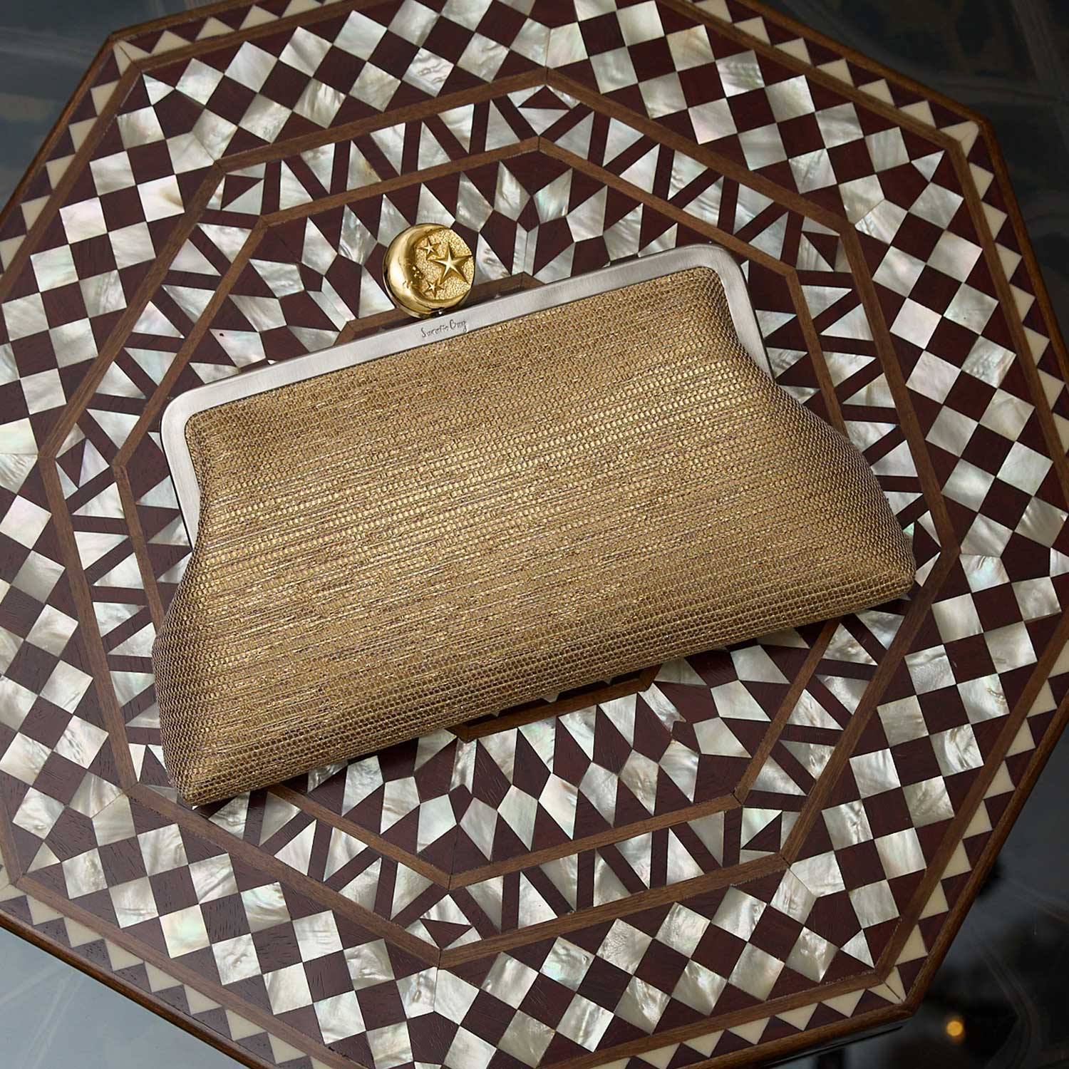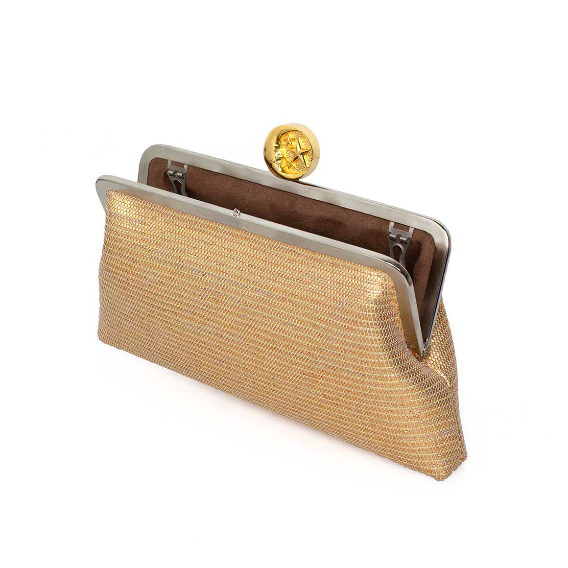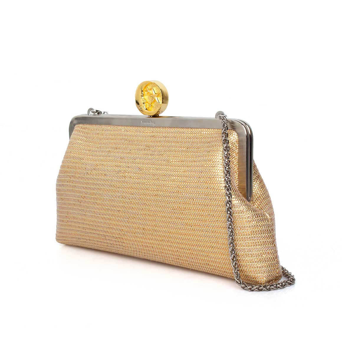The Moon On Gold Classic a luminous gold evening bag, crafted in textured metallic soft fabric. The sculpted moon clasp adds a celestial accent, while the optional chain allows for effortless handheld or shoulder wear. A refined choice for elevating any formal look.