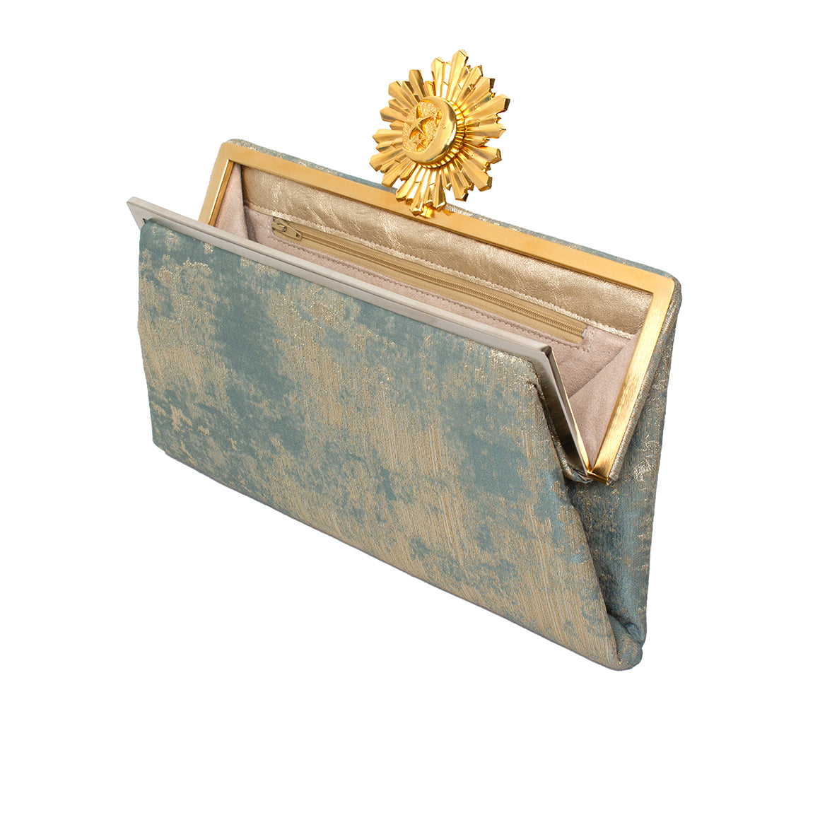 Moon Rays on Lagoon Grace features a softly textured lagoon-toned surface with a refined, structured silhouette. The design is highlighted by a sculptural moon rays clasp that adds a bold, luminous focal point. Finished with a metallic frame and compact interior, it’s an elegant choice for evening occasions and special events.