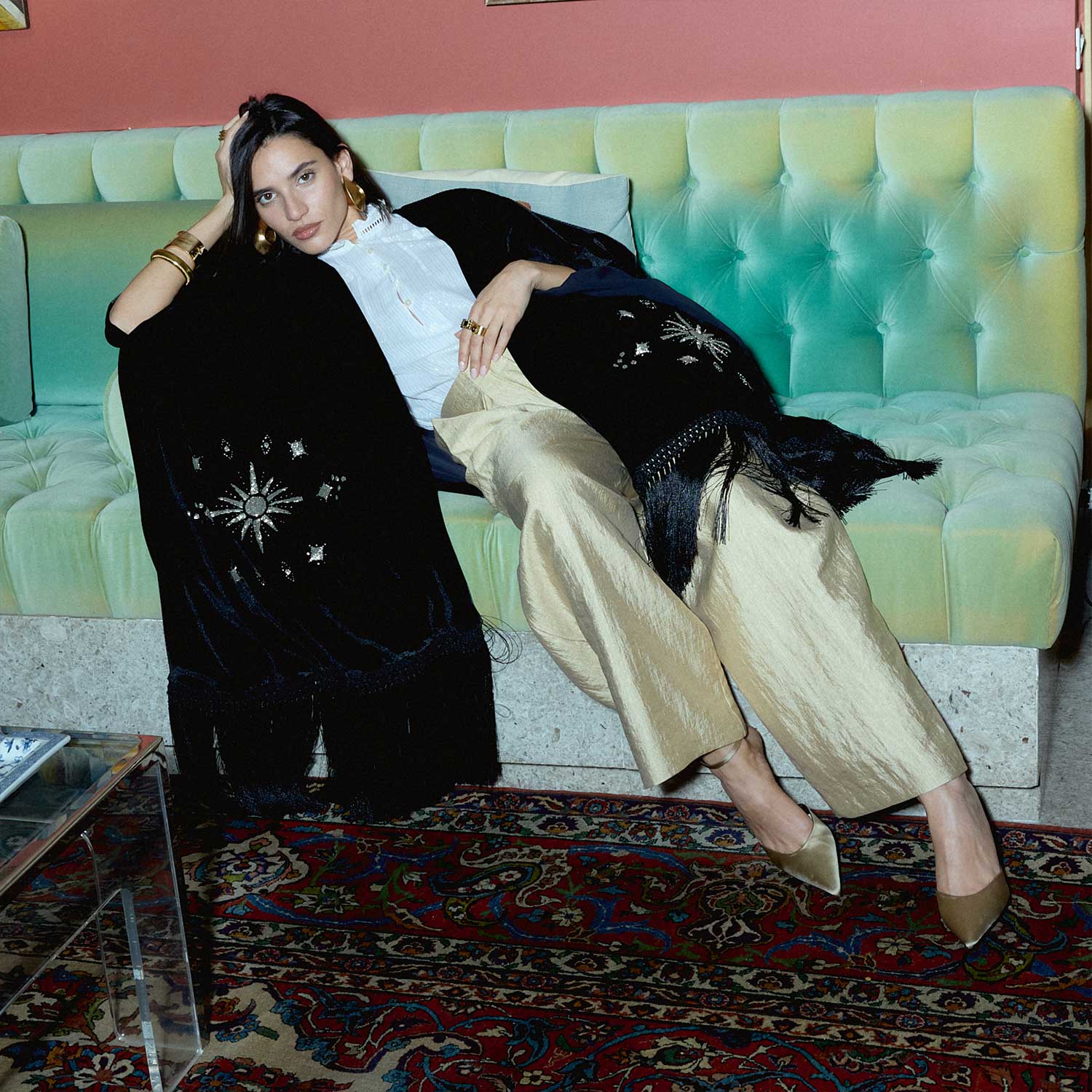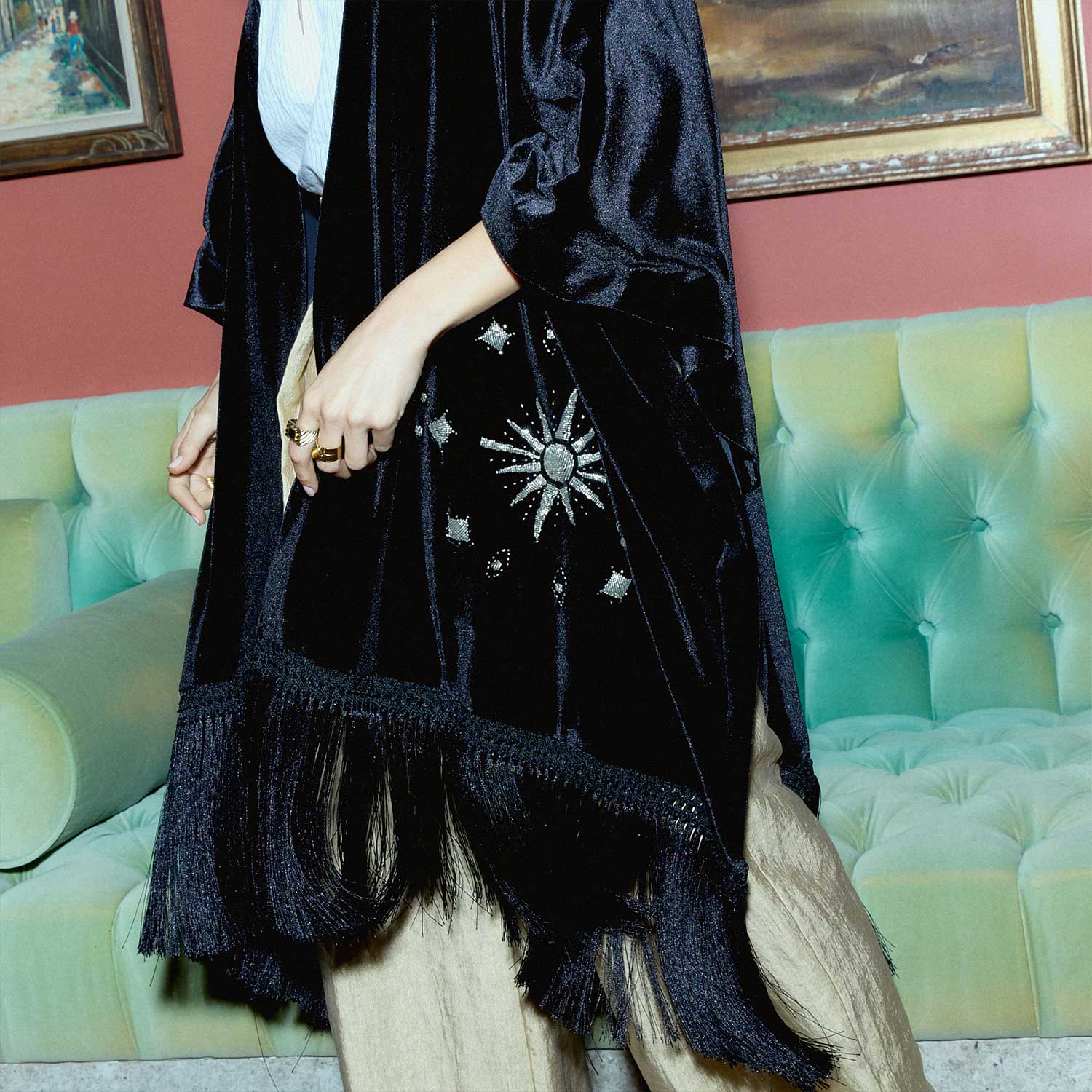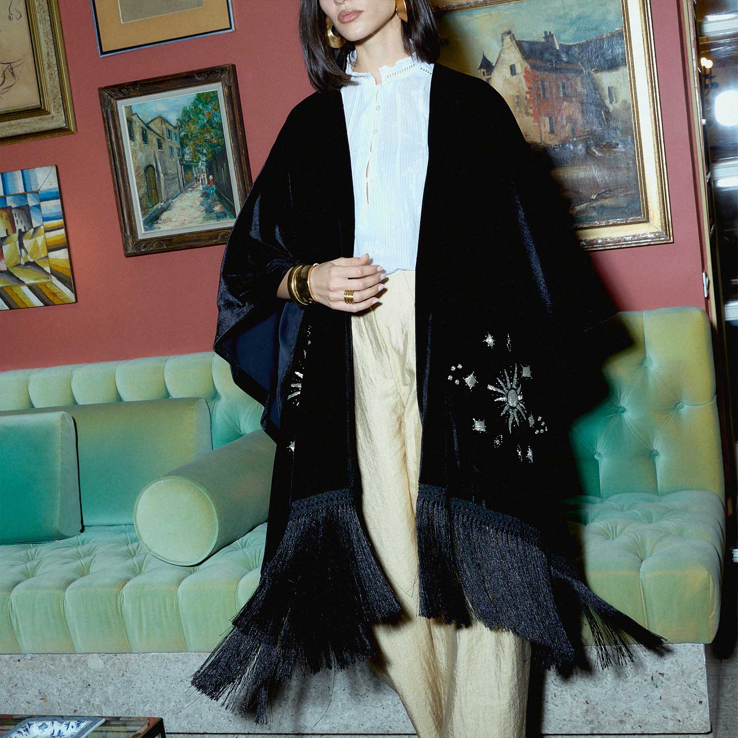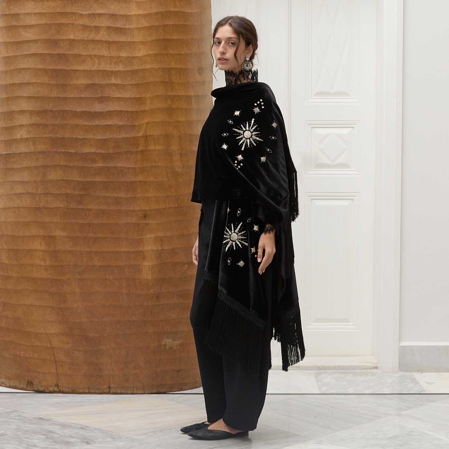 The Rising Sun on Black Velvet Poncho features a bold hand-beaded sun motif in silvery glass beads, accented with scattered star details across rich black velvet. The embroidery creates texture and movement, enhanced by fine fringe accents along the edges. Designed for versatile styling, it can be worn loosely over the shoulders, draped asymmetrically, or layered over tailored looks. A distinctive piece suited for special occasions, evening gatherings, and refined celebrations.