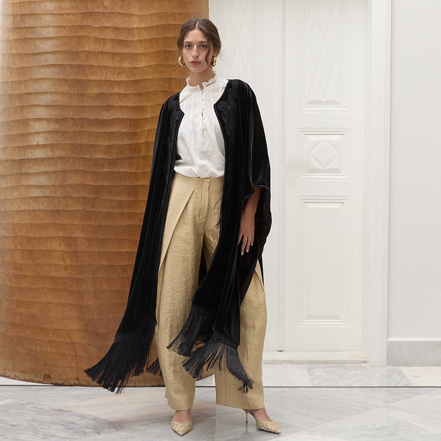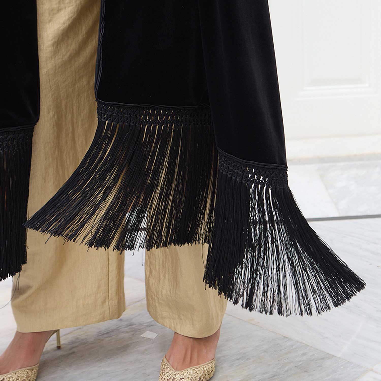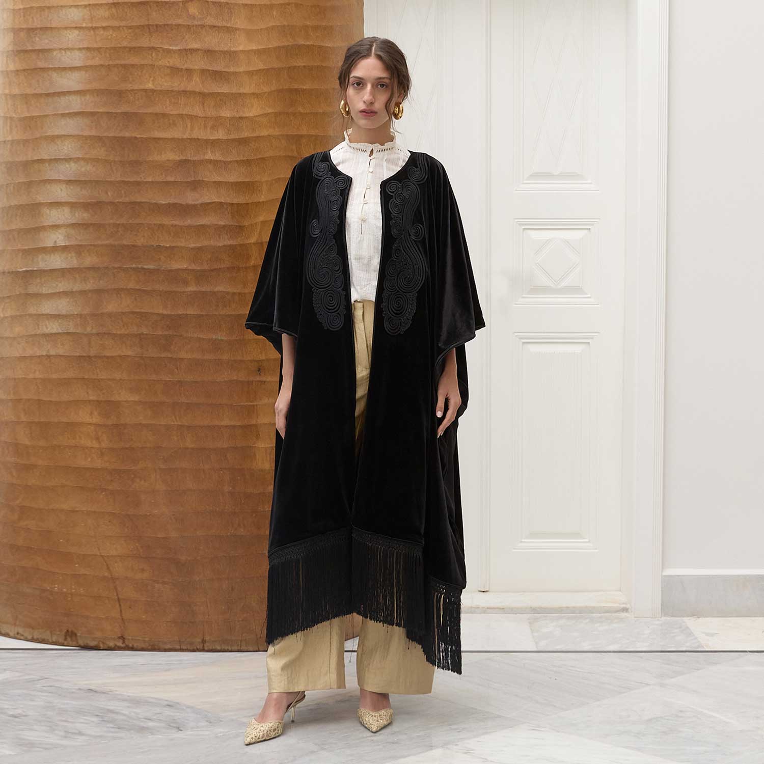 Soft and fluid in feel, this velvet piece is designed for relaxed elegance and easy movement. Swirls on Velvet Black Fringed Poncho features tonal swirl embroidery placed along the front, adding subtle texture without overpowering the look. Finished with a delicate fringe at the hem, the poncho drapes effortlessly over day or evening outfits for a refined yet understated statement.