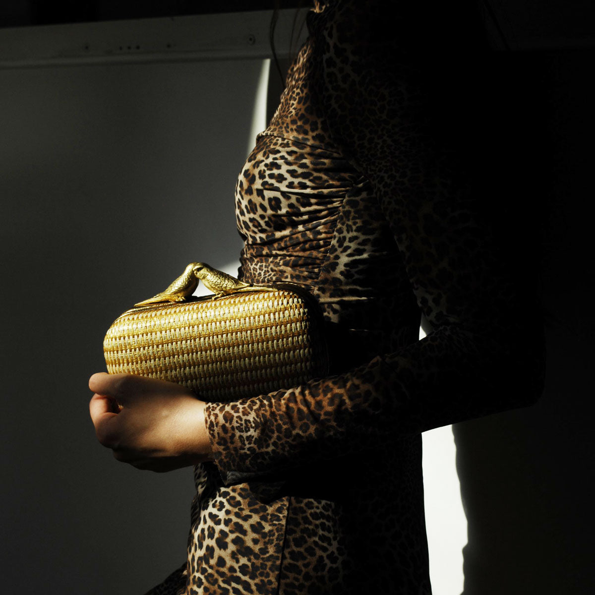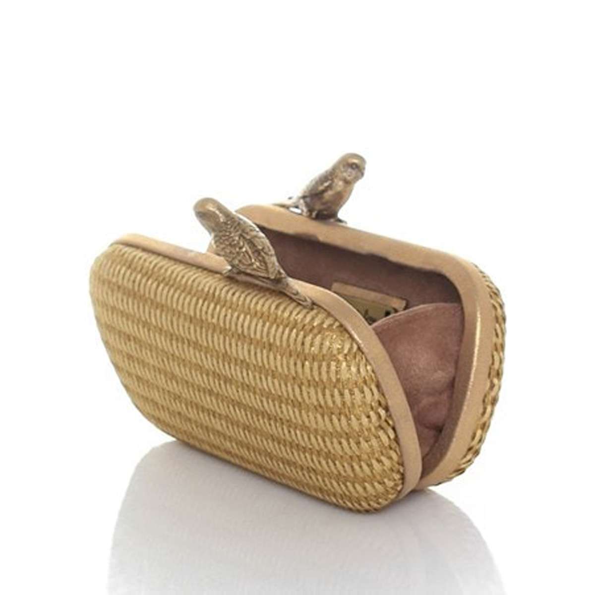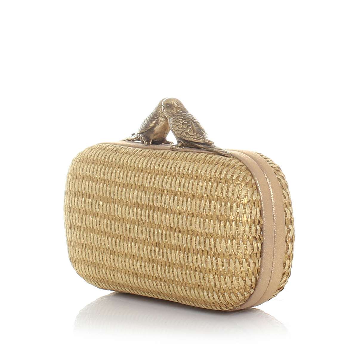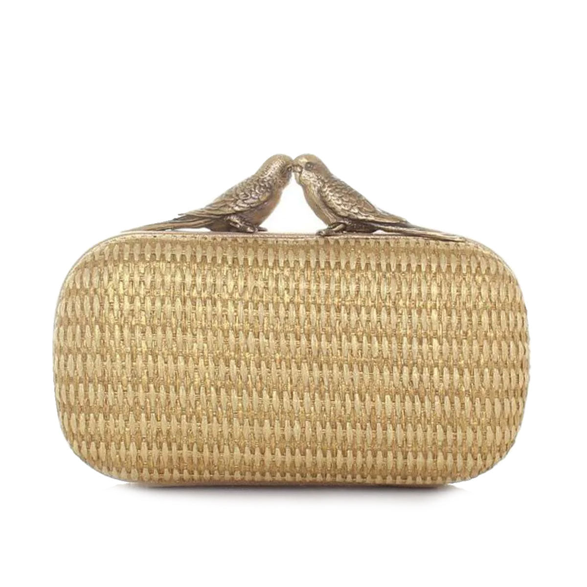 Shine all night long with this evening clutch. The Birds Gold box has a chameleon-like quality of matching any evening look, from red-carpet glamour to minimalist edge. The clutch is topped off with Sarah’s Bag signature bronze embracing budgies clasp.