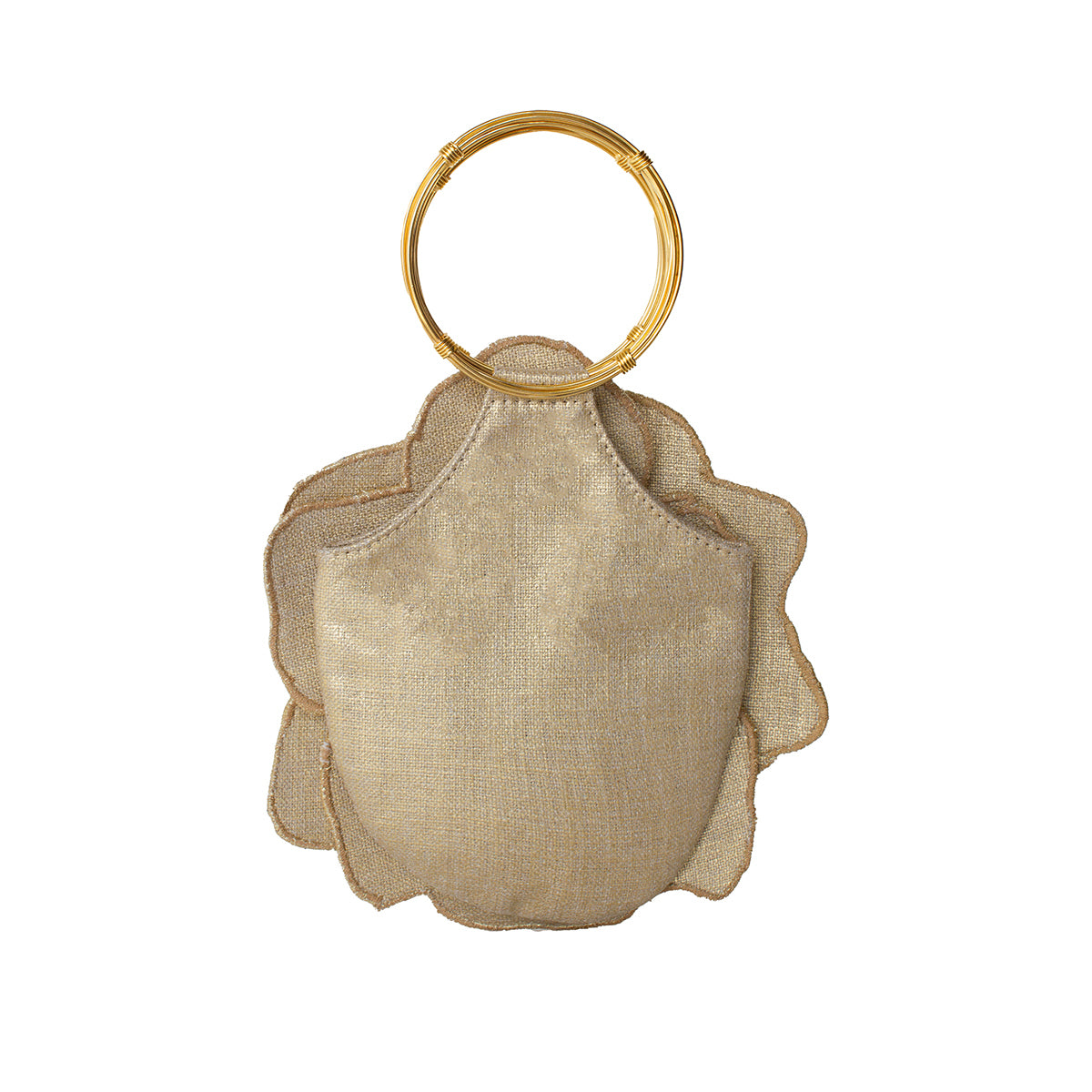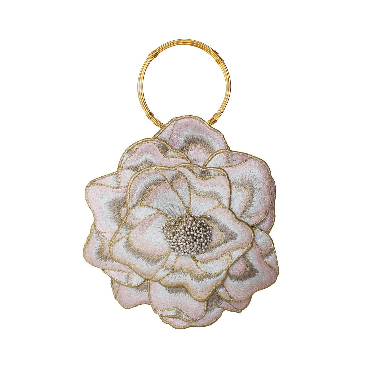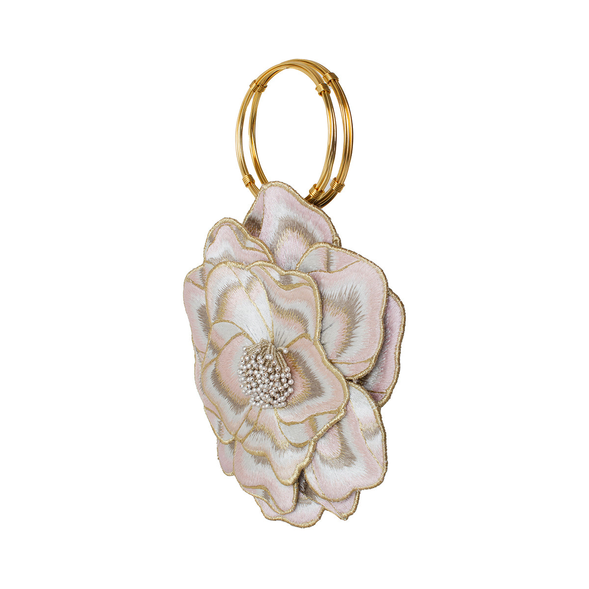 The Grand Magnolia Gold Flapper Wristlet is crafted in the shape of a blooming magnolia, intricately embroidered in soft pink, ivory, and gold threads. Its center features delicate hand-beaded pearl clusters, adding depth and texture. Finished with a gold-tone metal handle ring, this piece merges wearable art with function ideal for weddings and formal occasions.