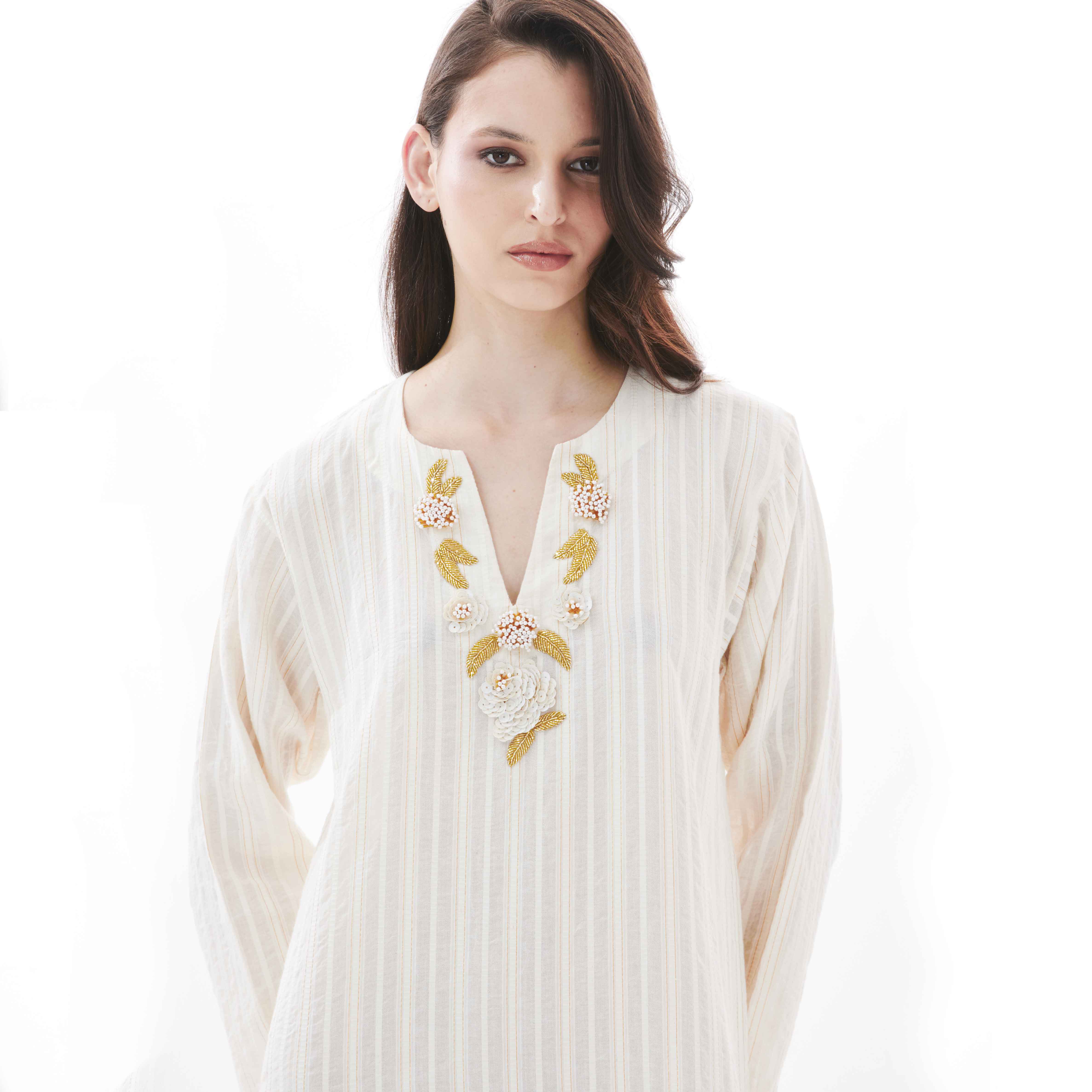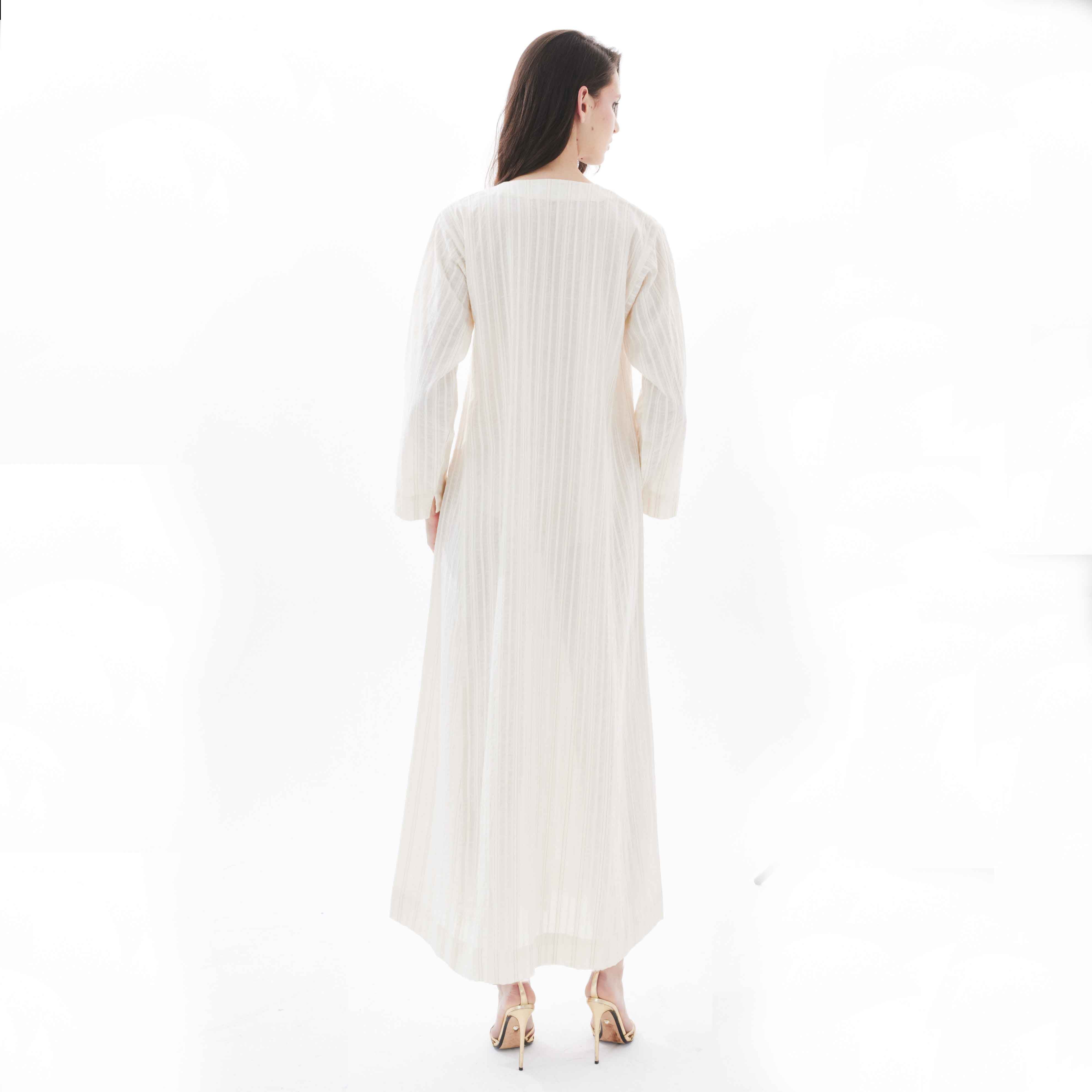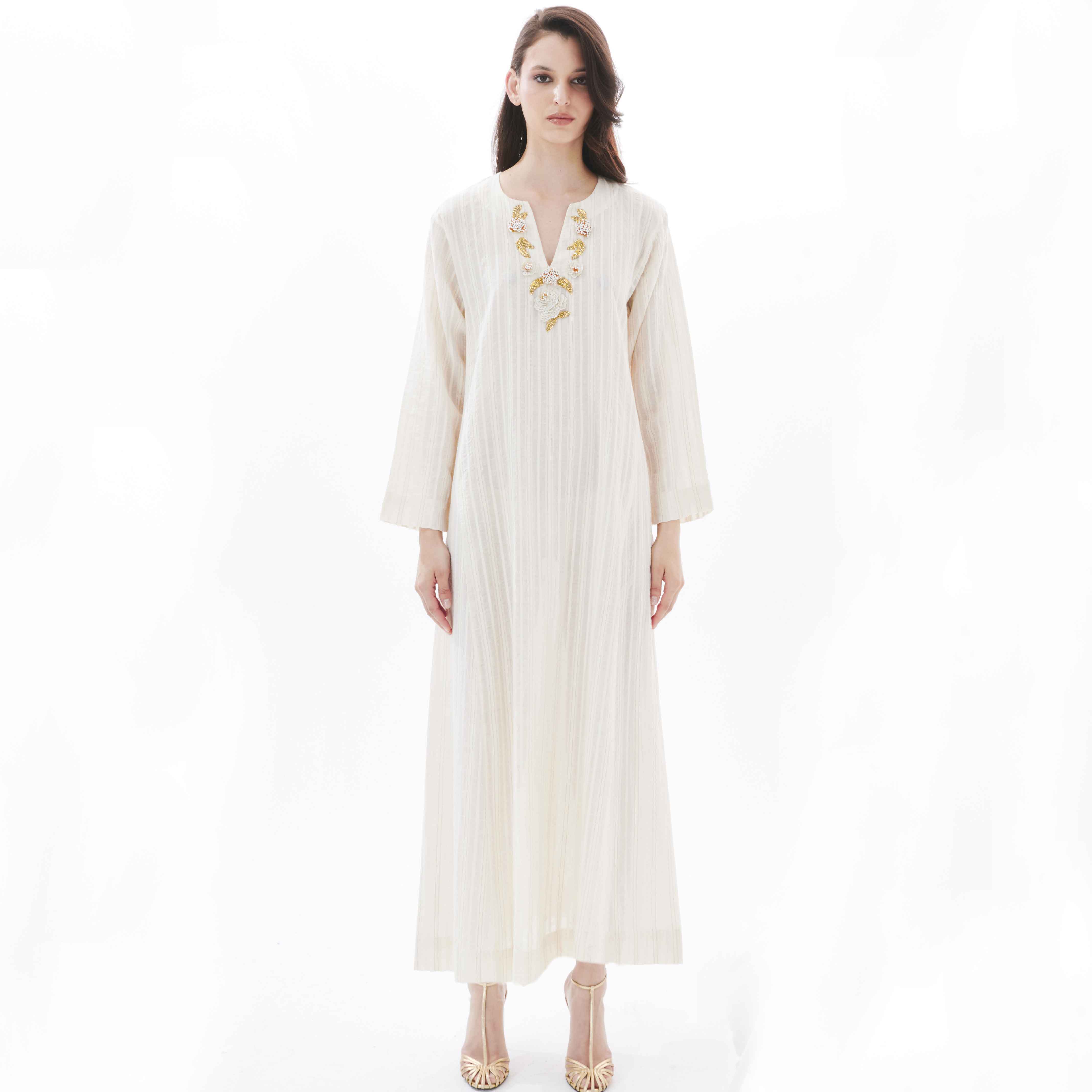 Elevate your everyday wardrobe with the Ivory Yasmine on Beige Amal Dress, a versatile piece designed to be worn solo or layered under the Ivory Yasmine on Beige abaya. Cut from breathable striped cotton, its relaxed silhouette flows effortlessly to an ankle-grazing length. The hand-sequined flowers at the neckline, in soft ivory, gold and silver, brings a subtle touch of glamour. Whether styled with flats for a laid-back appeal or cinched at the waist for a more tailored look, this dress offers understated sophistication for any occasion