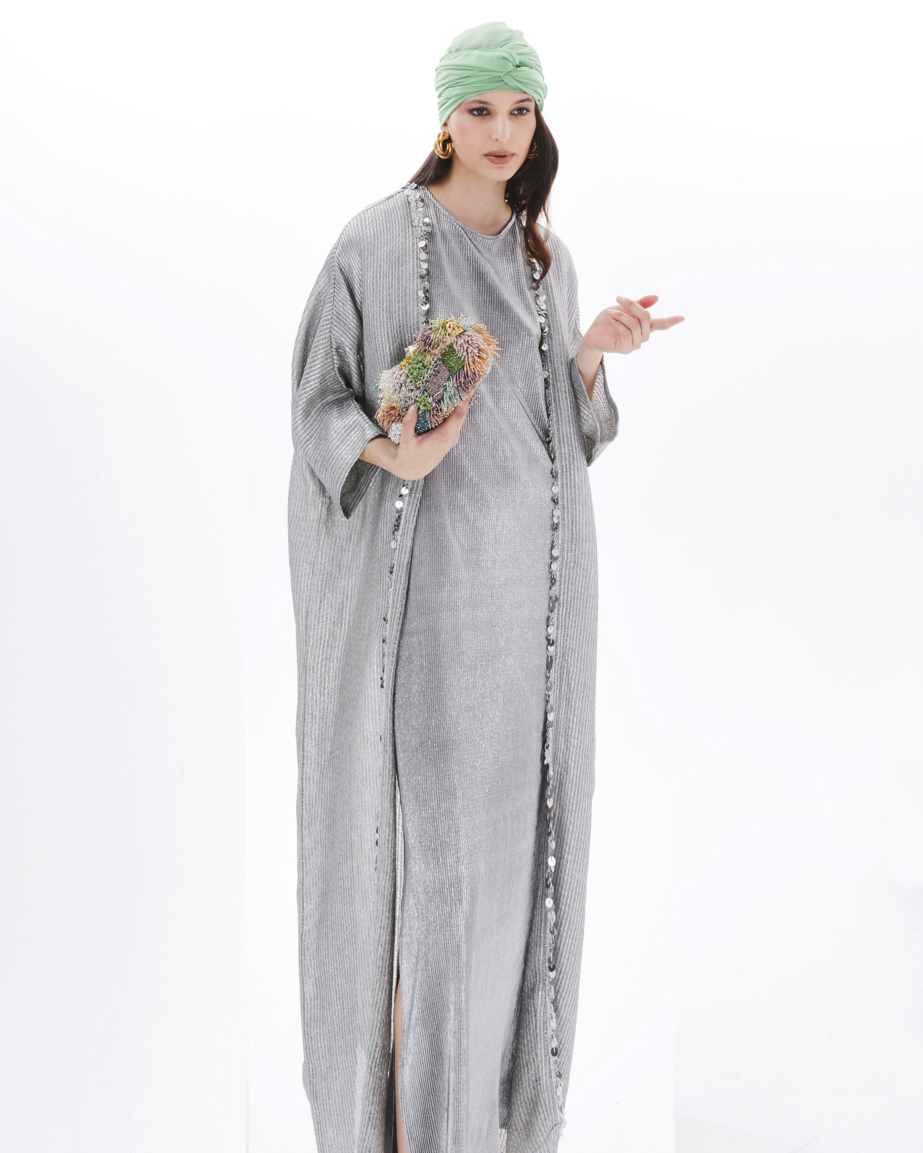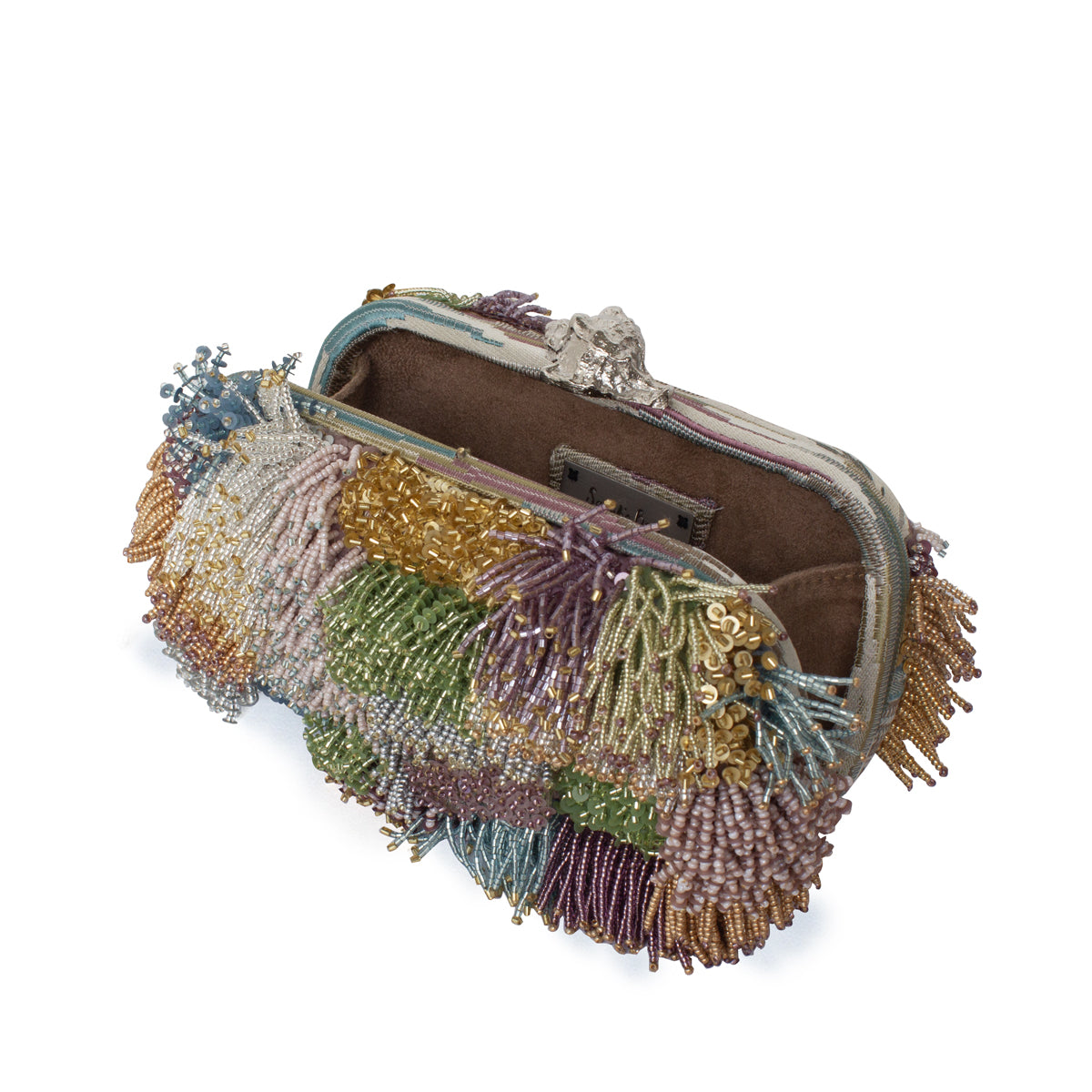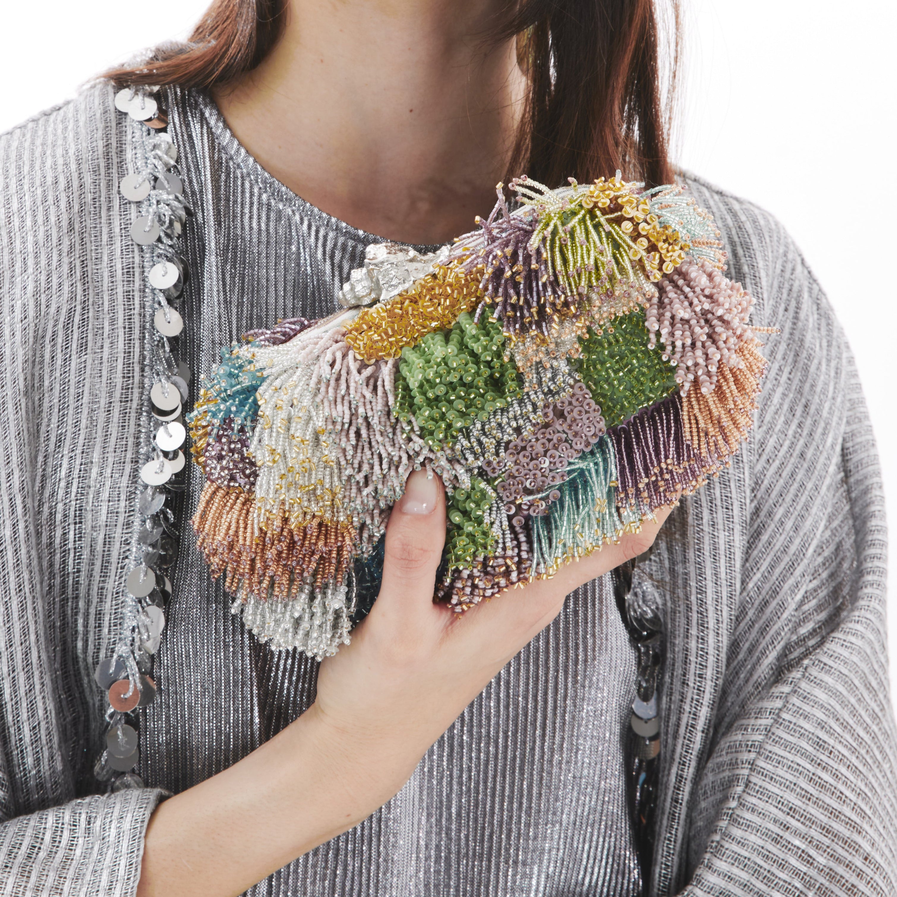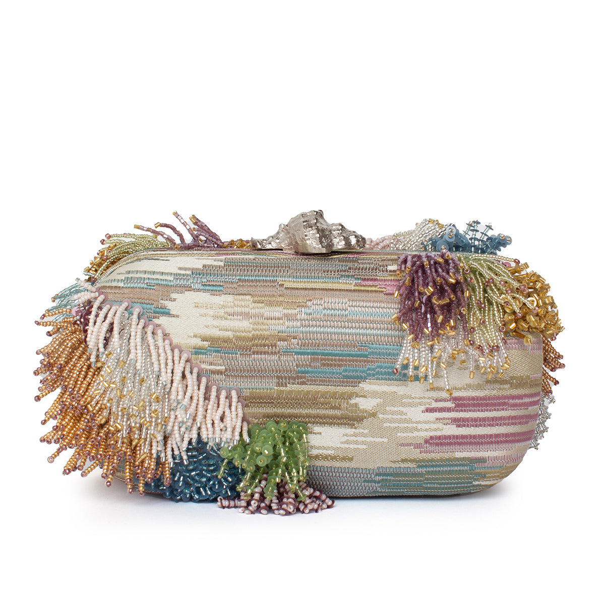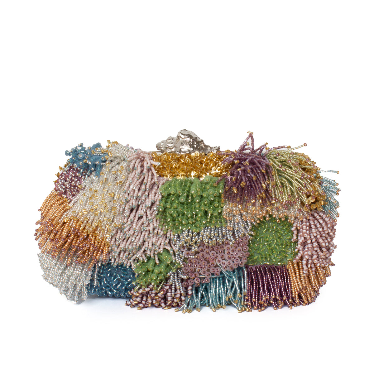 The Lush Pastel Box Clutch features a structured silhouette adorned with a patchwork of soft pastel tones. Hand-beaded using four distinct techniques, it combines loops, fringes, clusters, and layered levels for a richly textured effect. A sculptural silver murex clasp completes the design. Meant to be carried by hand, it’s a bold, artisanal piece for evening occasions.
