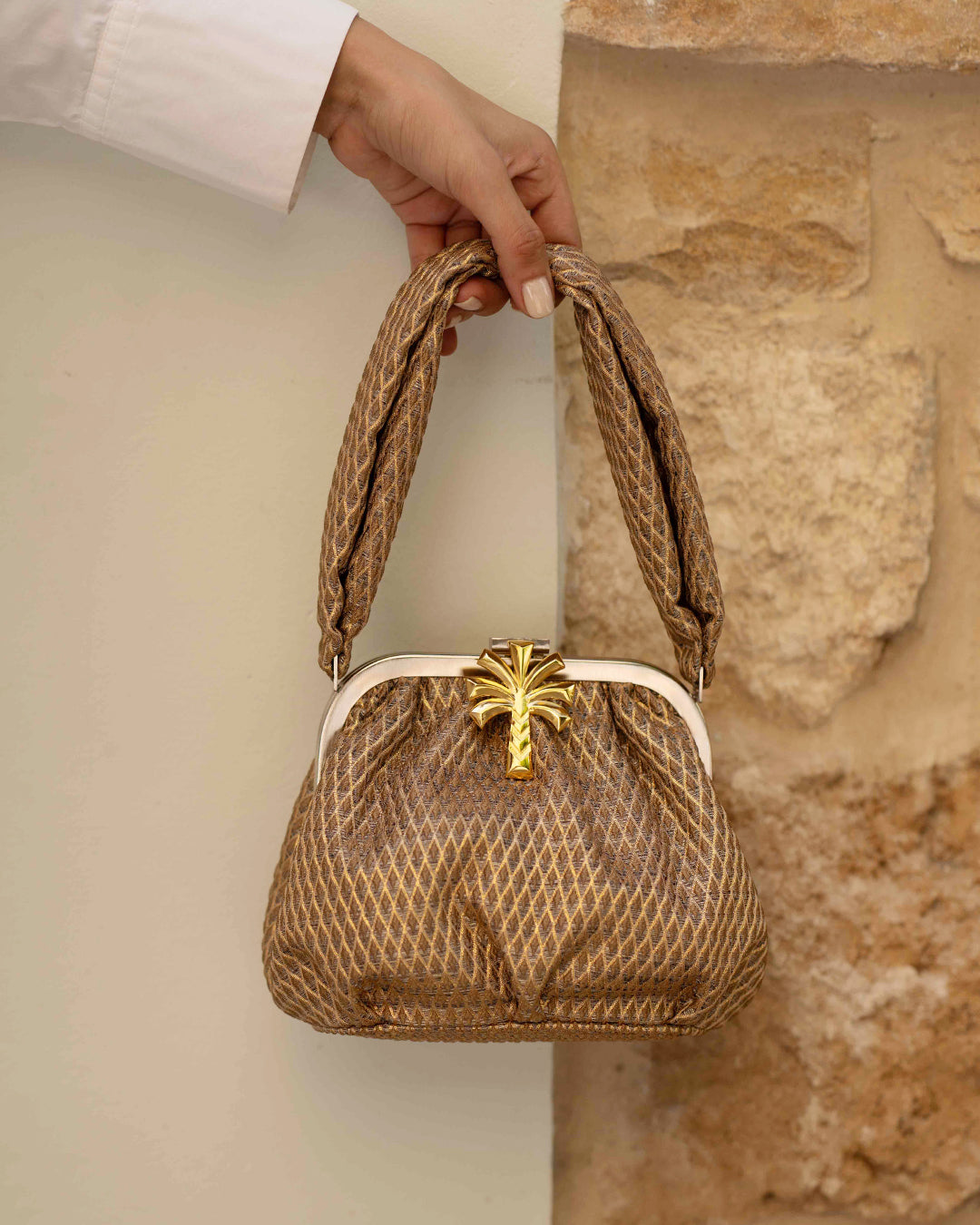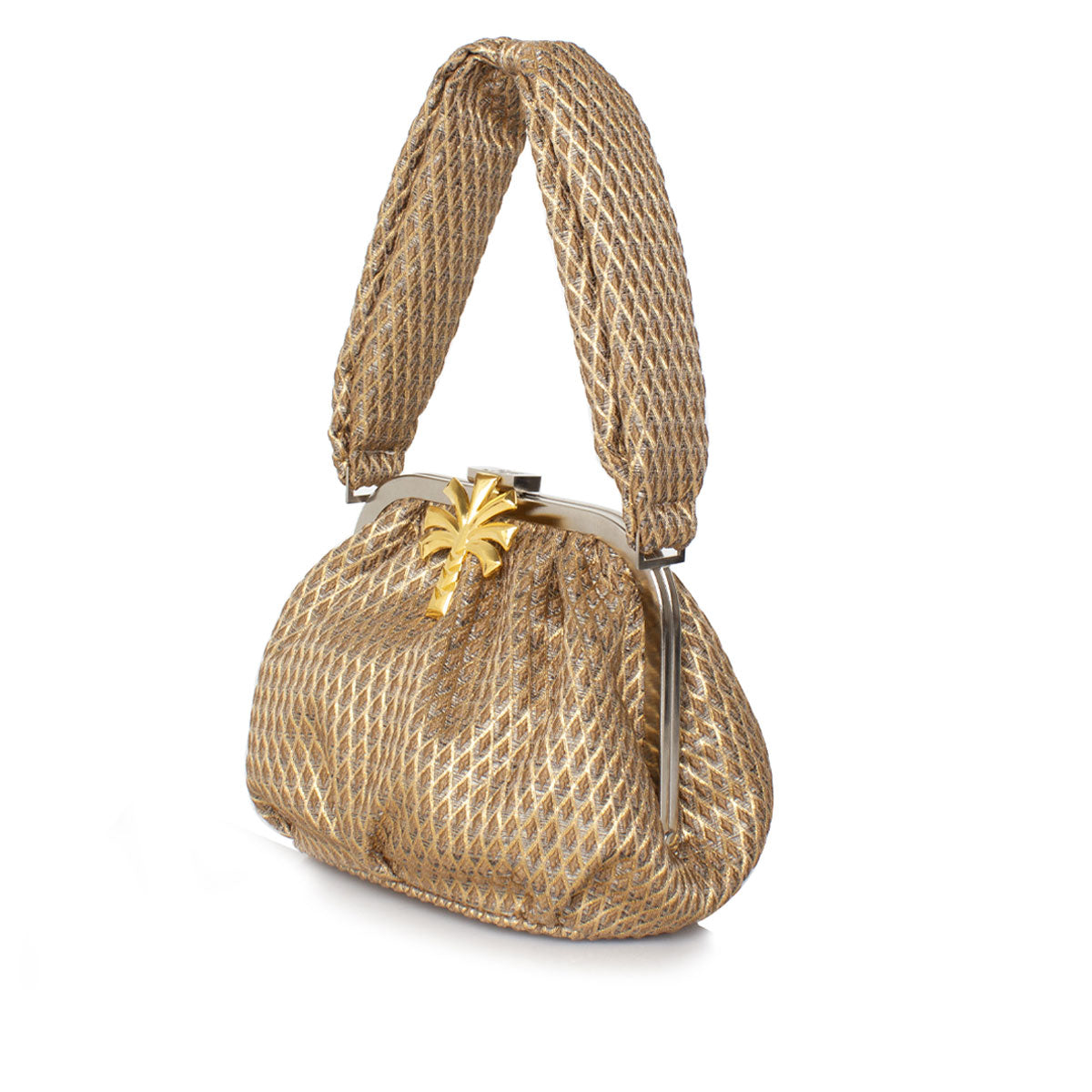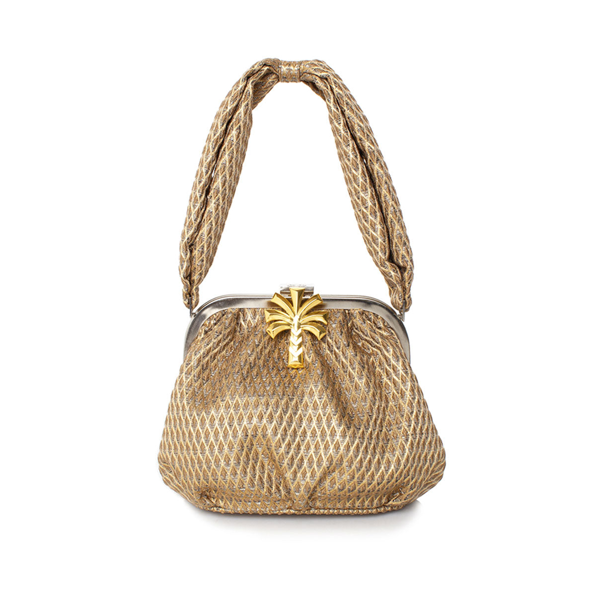 The Palm on Marquise Gold Bella reflects understated luxury and timeless elegance. Crafted from opulent gold satin with a textured weave, this bag reflects sophisticated charm while honoring the prosperity and vitality represented by the golden palm tree emblem. Perfect for special occasions, this bag seamlessly combines traditional values with a refined, modern design, making it a stunning piece of cultural significance and elegance.