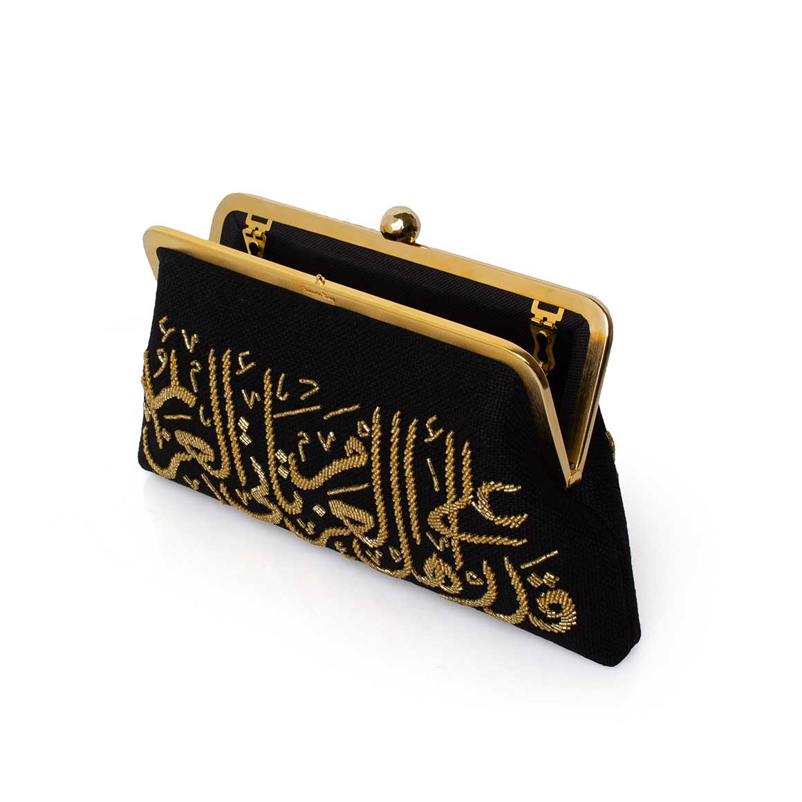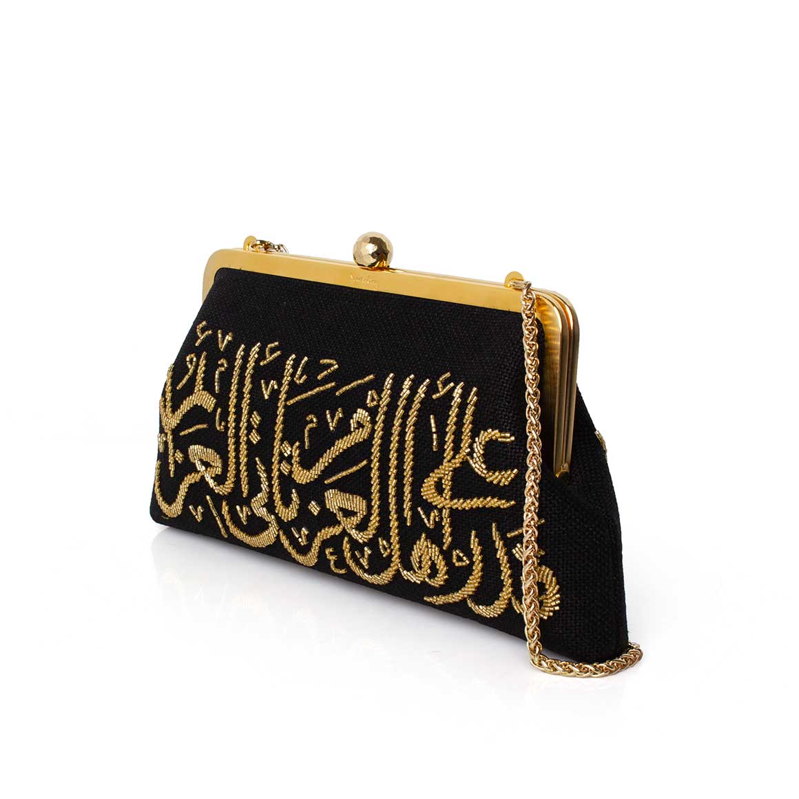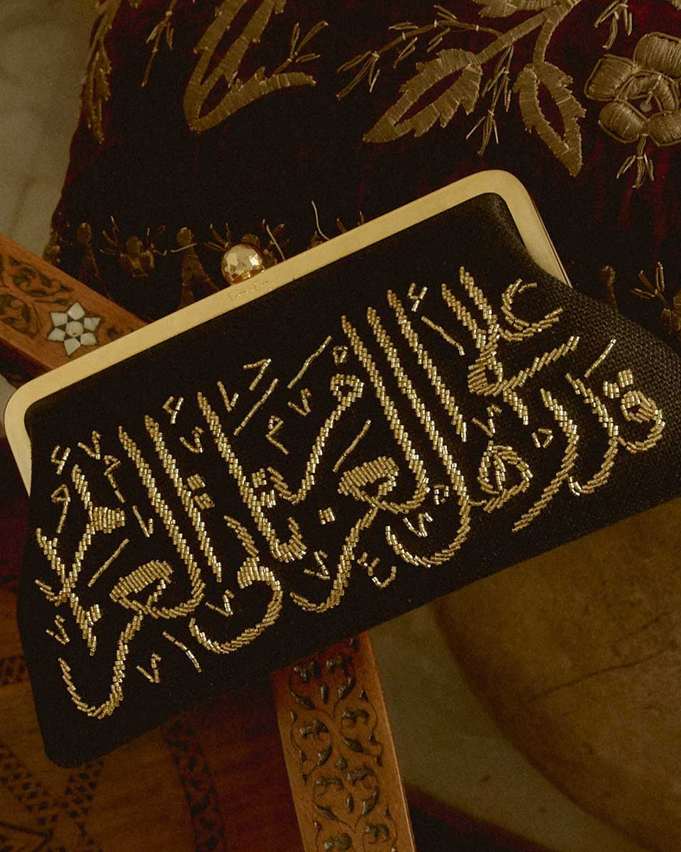 Unveil the Calligraphy Gold on Black Classic a Sarah’s bag evening classic featuring the profound words of Arabic poet Al Mutanabbi, "Life’s invitations come to those with determination," delicately rendered in graphic Arabic calligraphy and meticulously hand-beaded with golden glass beads. This clutch transcends mere accessory status, serving as a bold declaration of unwavering resolve. With a versatile chain included, offering versatility and adaptability.
