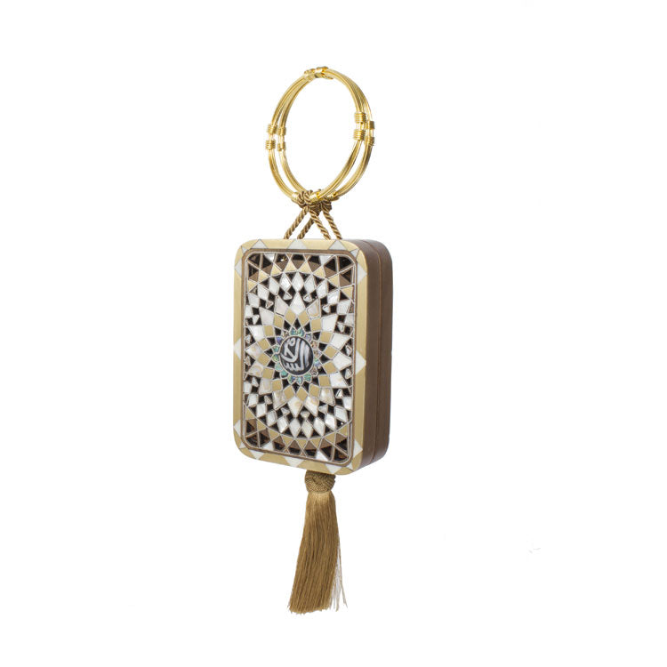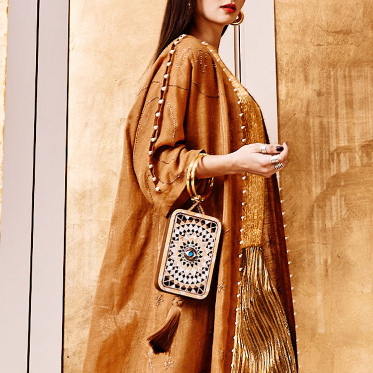 The Mandala Gold Menottes bracelet bag, seamlessly blending Mandala intricacy with the traditional Levantine technique of mother-of-pearl inlay on nude walnut wood. The color palette transitions from pearlescent hues to an evil eye center on one side and "Al Salam" center on the other side. This compact Mandala clutch features a twin pair of gold bracelet handles and opens/closes on the side with an internal magnetic fastening system.