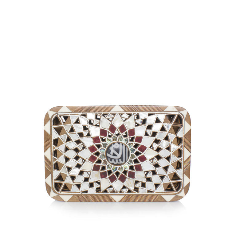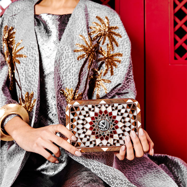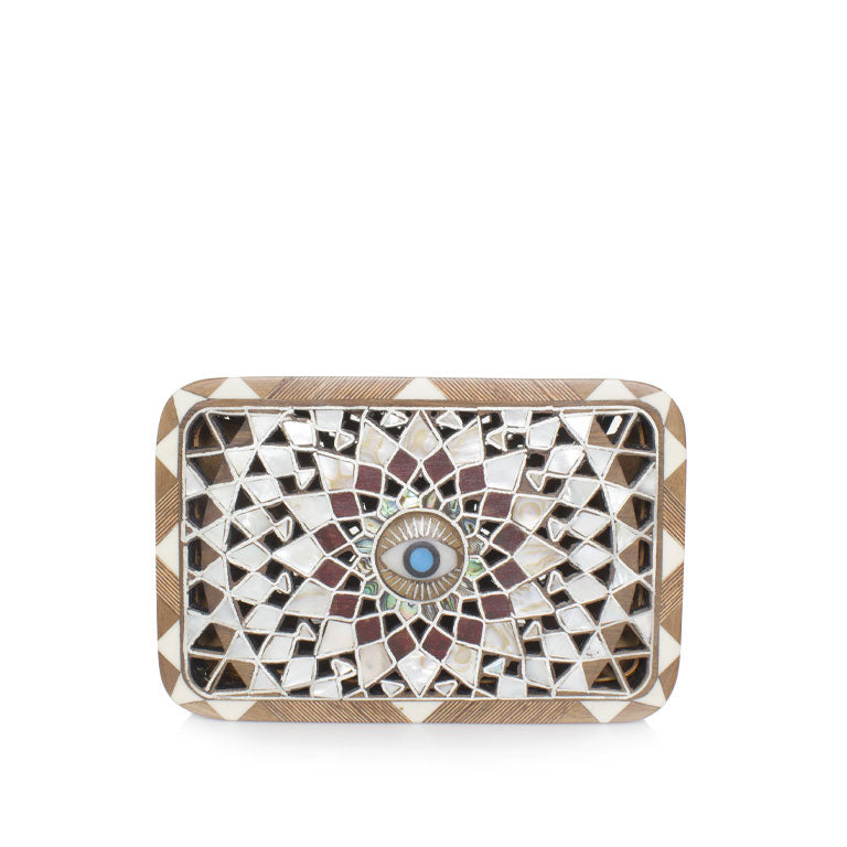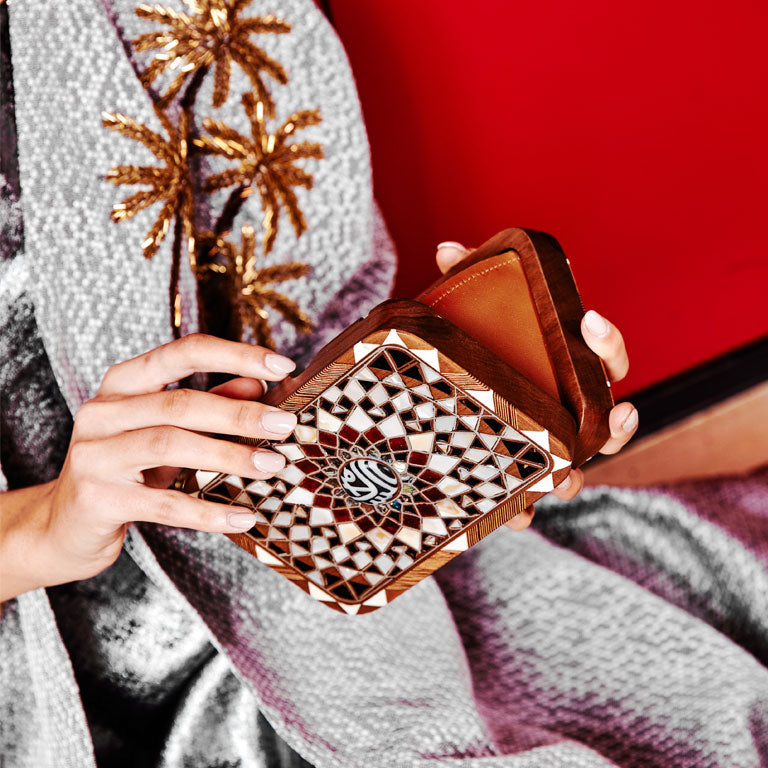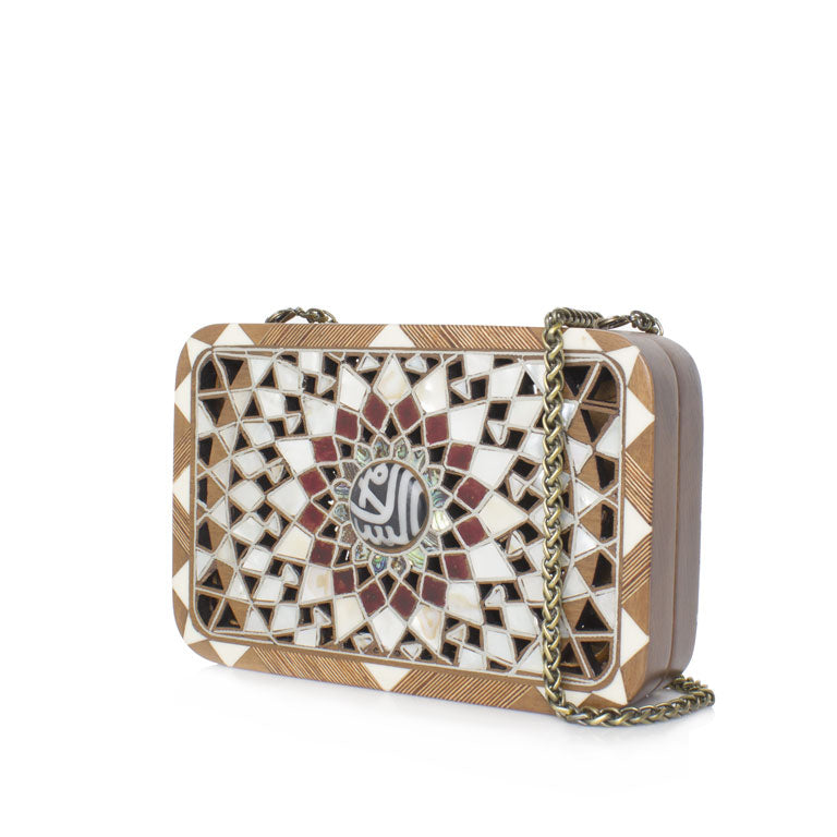 The Silver Mandala clutch, where Mandala intricacy converges with the traditional Levantine art of mother-of-pearl inlay on nude walnut wood. The color palette transitions seamlessly from pearlescent tones to to an evil eye center on one side and "Al Salam " center on the other side. This compact Mandala clutch, designed for a hassle-free night out, features a stylish brass shoulder chain.