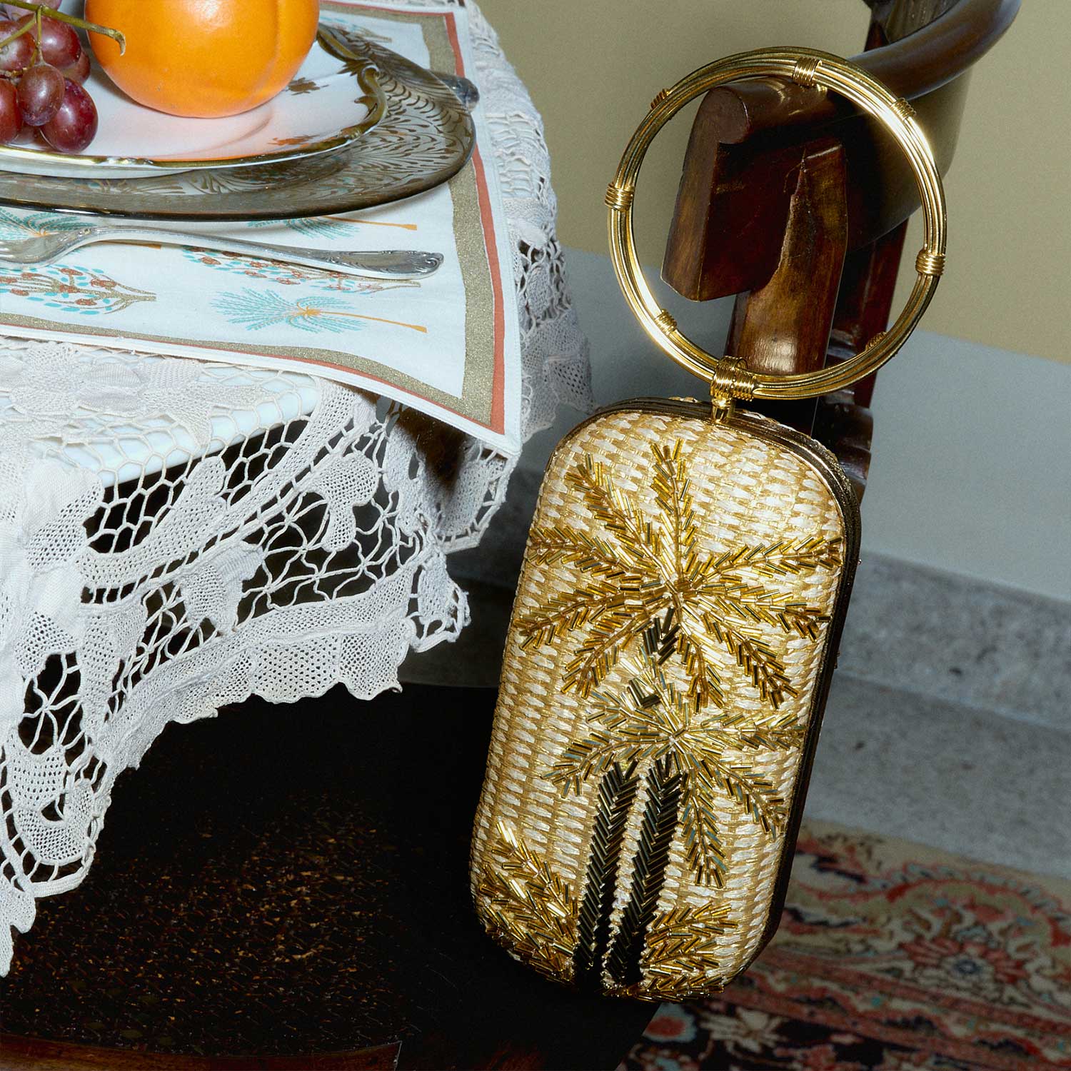 Inviting women to embrace the symbolism of the ever elegant Palm tree, The Golden Oasis Gold Straw Menottes, has a captivating metaphor in its center-the palm tree-representing femininity's determination, prosperity, and generosity. This elegant oval-shaped bag, meticulously hand-beaded with glass beads and featuring twin gold bracelet handles, is the true meaning of elegance blended. This bag opens and closes using a magnetic fastening method.