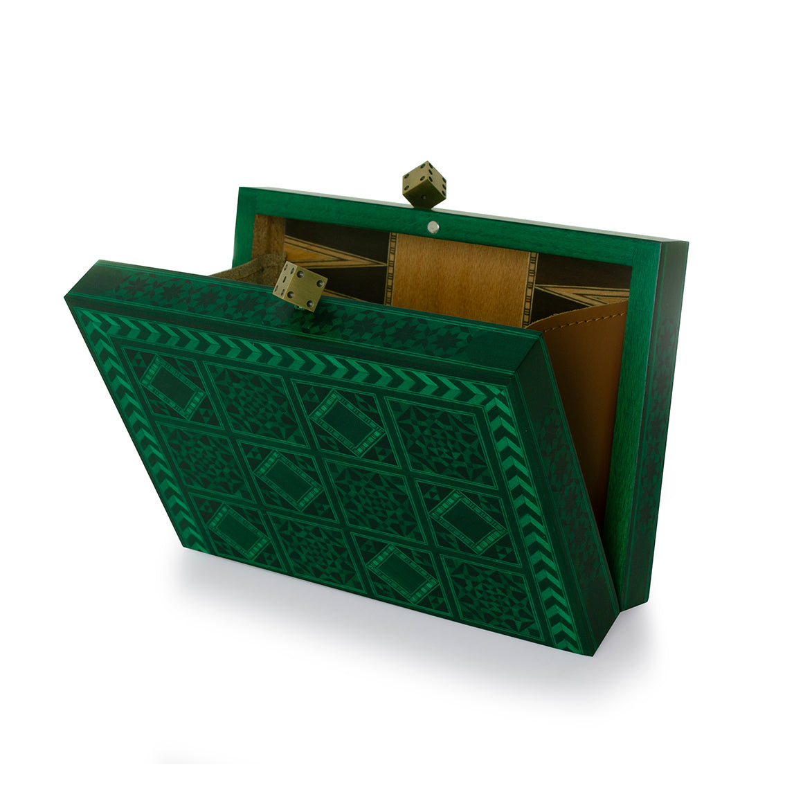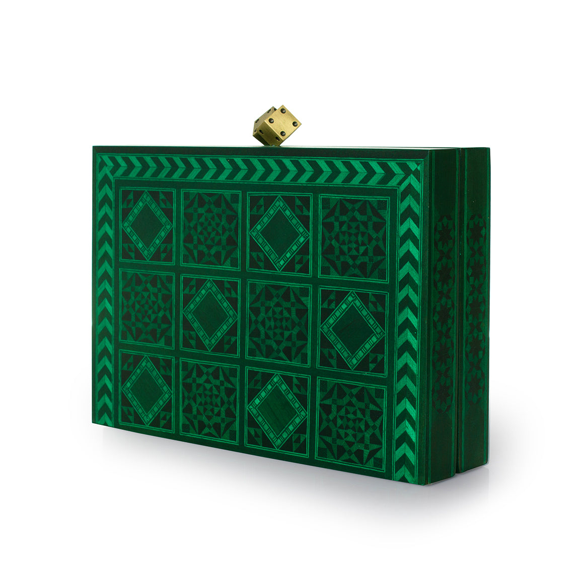 This statement clutch is miniature version of the traditional Mediterranean backgammon board and is a true manifestation of exquisite traditional craftsmanship. It showcases a centuries-old technique called marquetry where pieces of different types of wood are applied to a wood veneer to form mosaics, decorative patterns, and geometric shapes. A pair of solid metal bronze-colored dice that serve as a clasp, adds the perfect finishing touch.