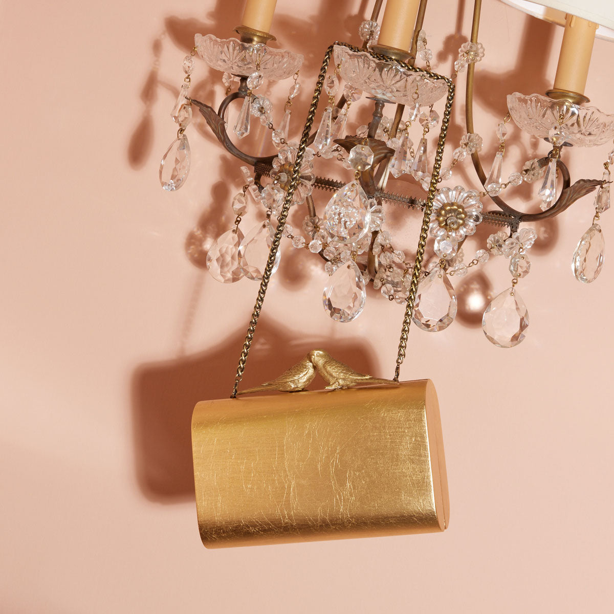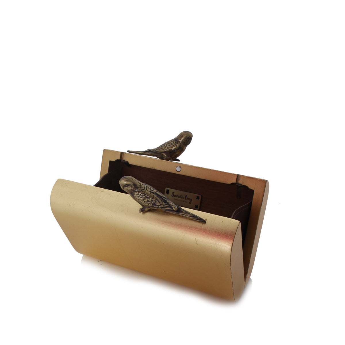 In the mood for wood? This hand-sized clutch is a true manifestation of exquisite craftsmanship. With a polished wooden exterior, the bag is topped with the signature embracing budgies clasp. It also comes with a metal chain that allows the bag to be slung over the shoulder for a hands-free day.