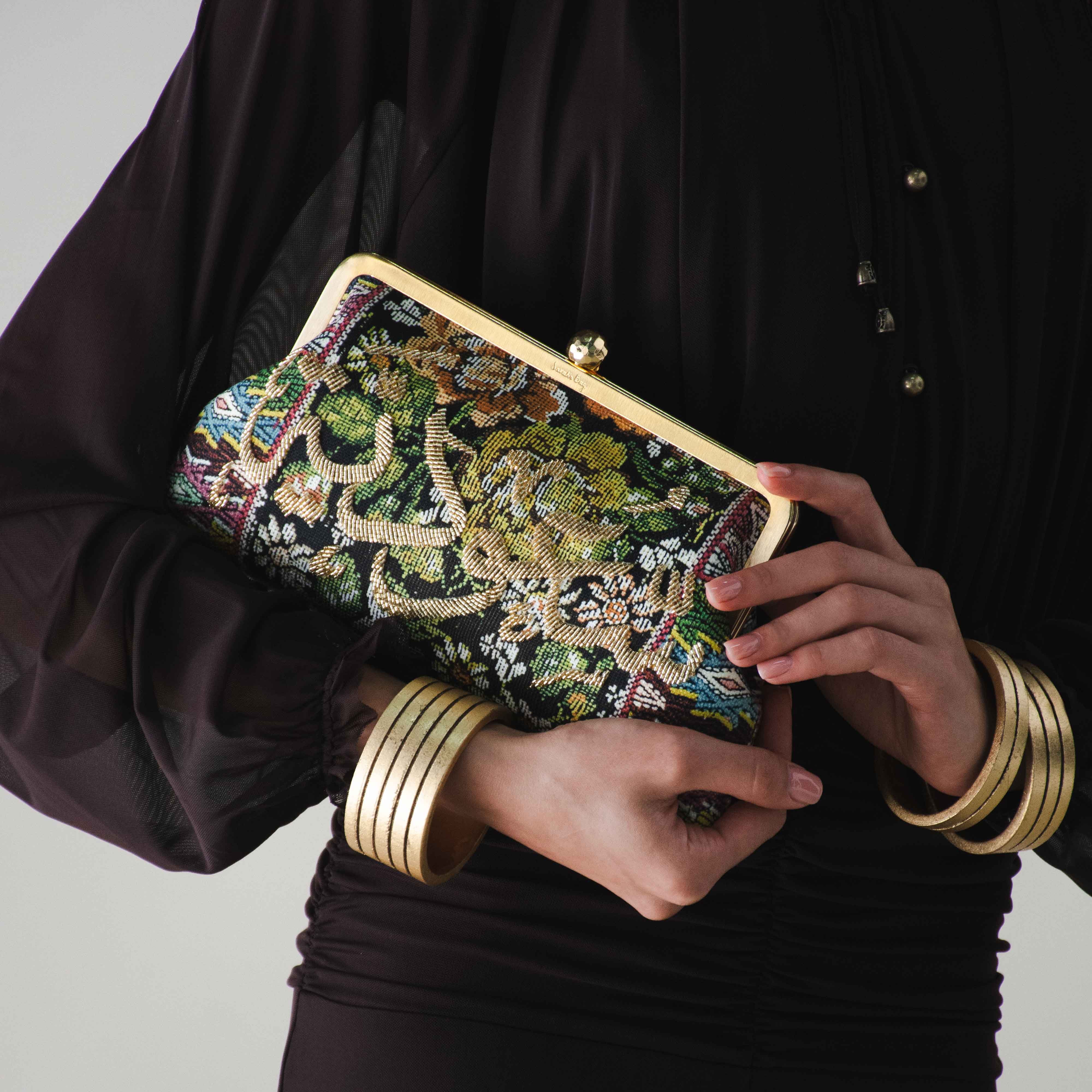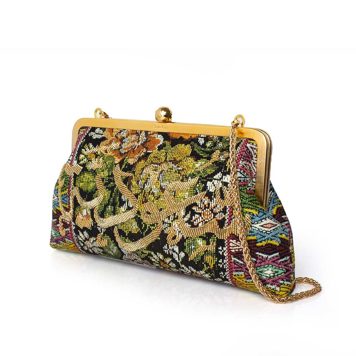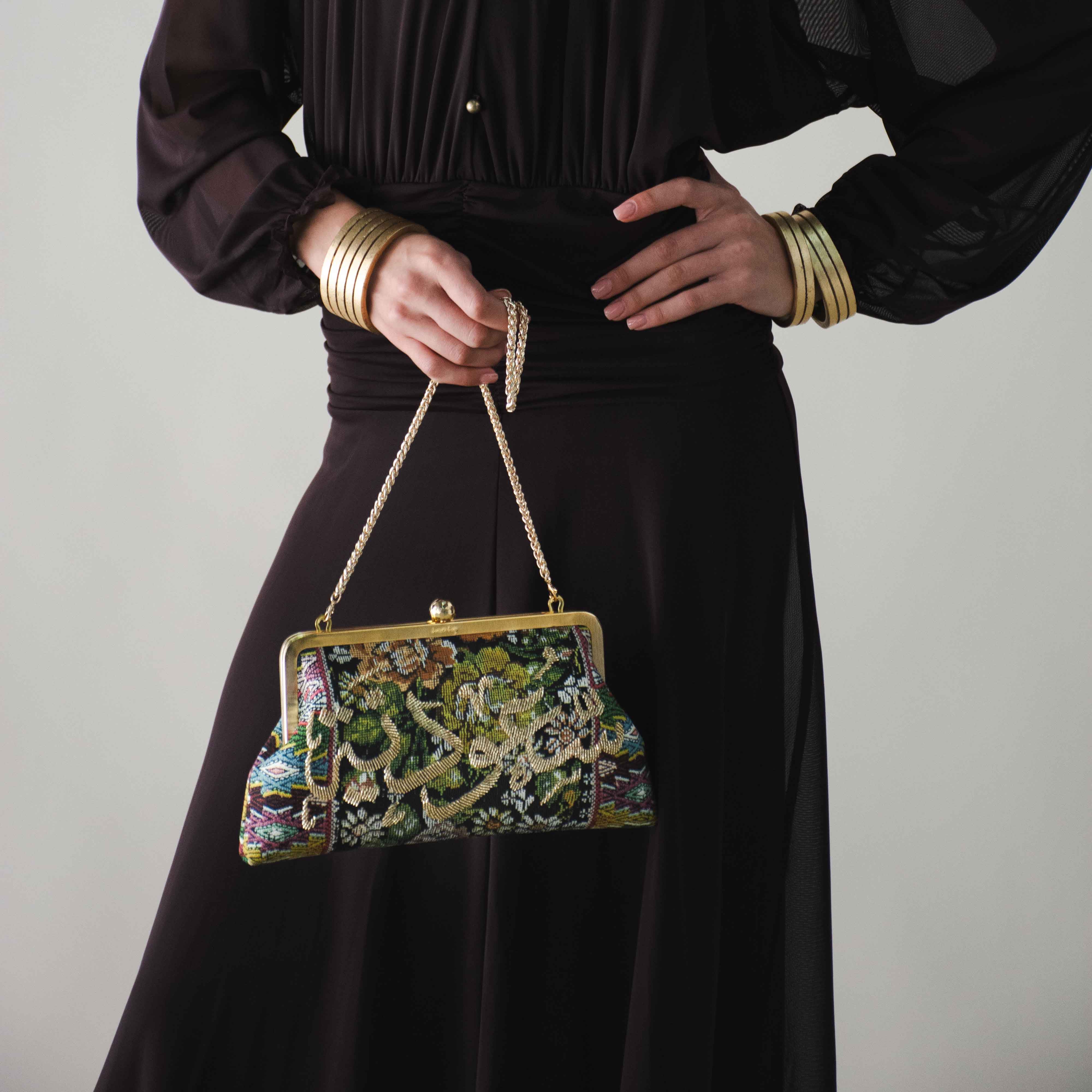 Intricately hand-beaded in shimmering bronze Arabic calligraphy, the word "Saoudiyah" (سعودية) is boldly embroidered over a lush tapestry of earthy florals and rich hues. A standout from the KSA Capsule Collection, it can be carried by hand or styled with a detachable chain for versatile sophistication.