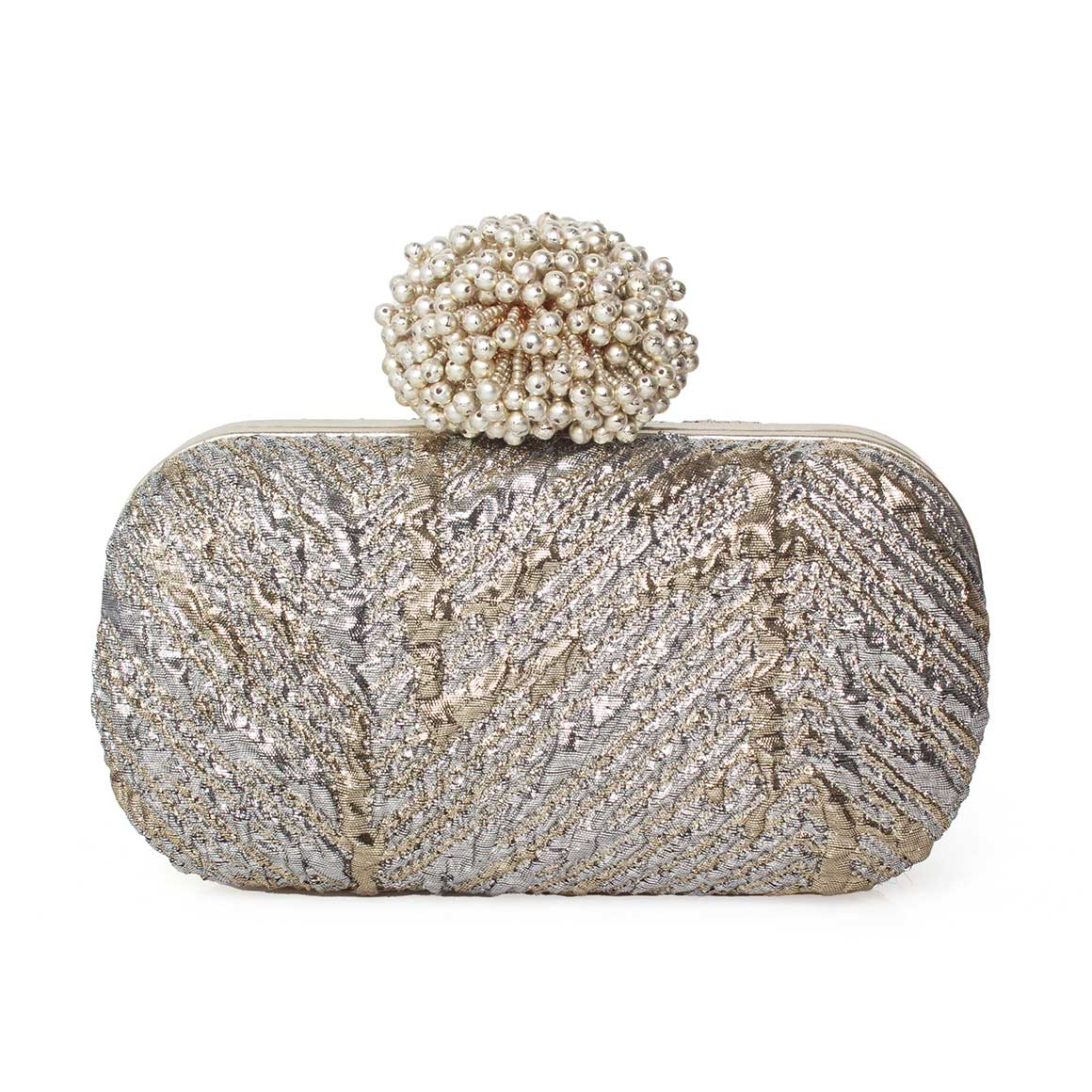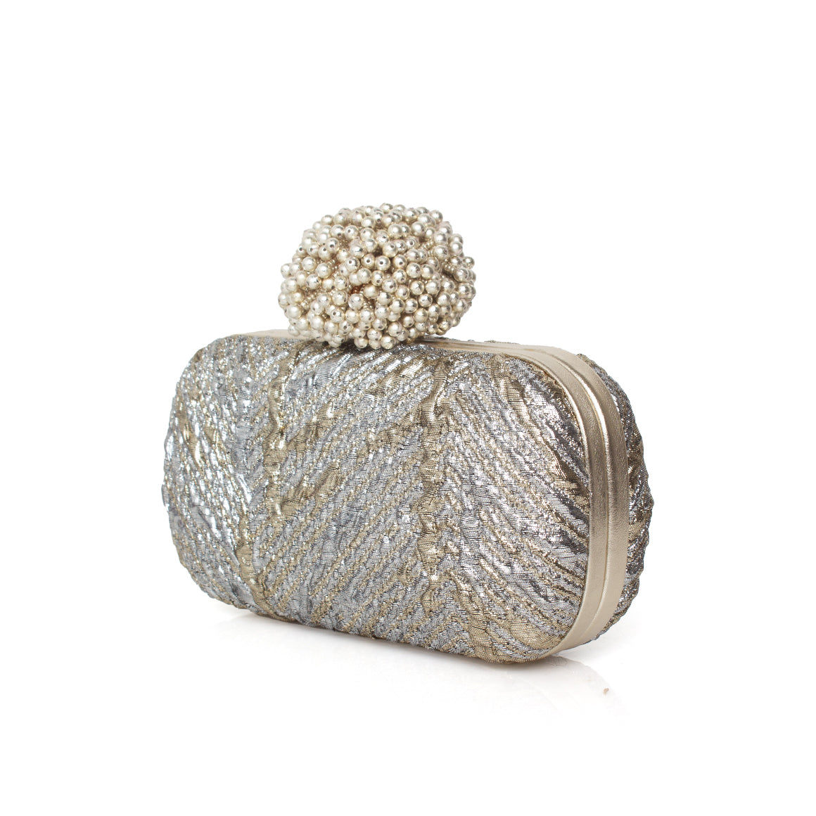 A statement piece with a rich metallic finish, the Dahlia on Aurora Box Clutch features a textured crossed pattern in silver and gold tones, framed with a sleek metal top. It is finished with a pearl-embellished dahlia clasp and opens to a compact interior for your evening essentials.
