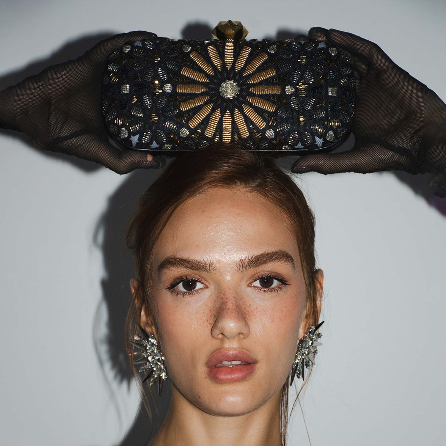 The Moroccan Metallic Big Box minaudière is a striking homage to Moroccan Zellij mosaic tilework, seamlessly blending luxurious craftsmanship with cultural artistry. This statement piece is intricately hand-embellished with glass beads in a sophisticated palette of gold, silver, and bronze, making it a versatile accessory that complements both gold and silver outfits. Its sleek box shape fits comfortably in hand, offering a compact yet elegant solution for evening essentials. Finished with an eye-catching, diamond-shaped clasp, this minaudière adds a refined touch to any special occasion look. The Moroccan Metallic Big Box is a glittering, season-to-season accessory and the perfect go-to piece for effortless glamour.