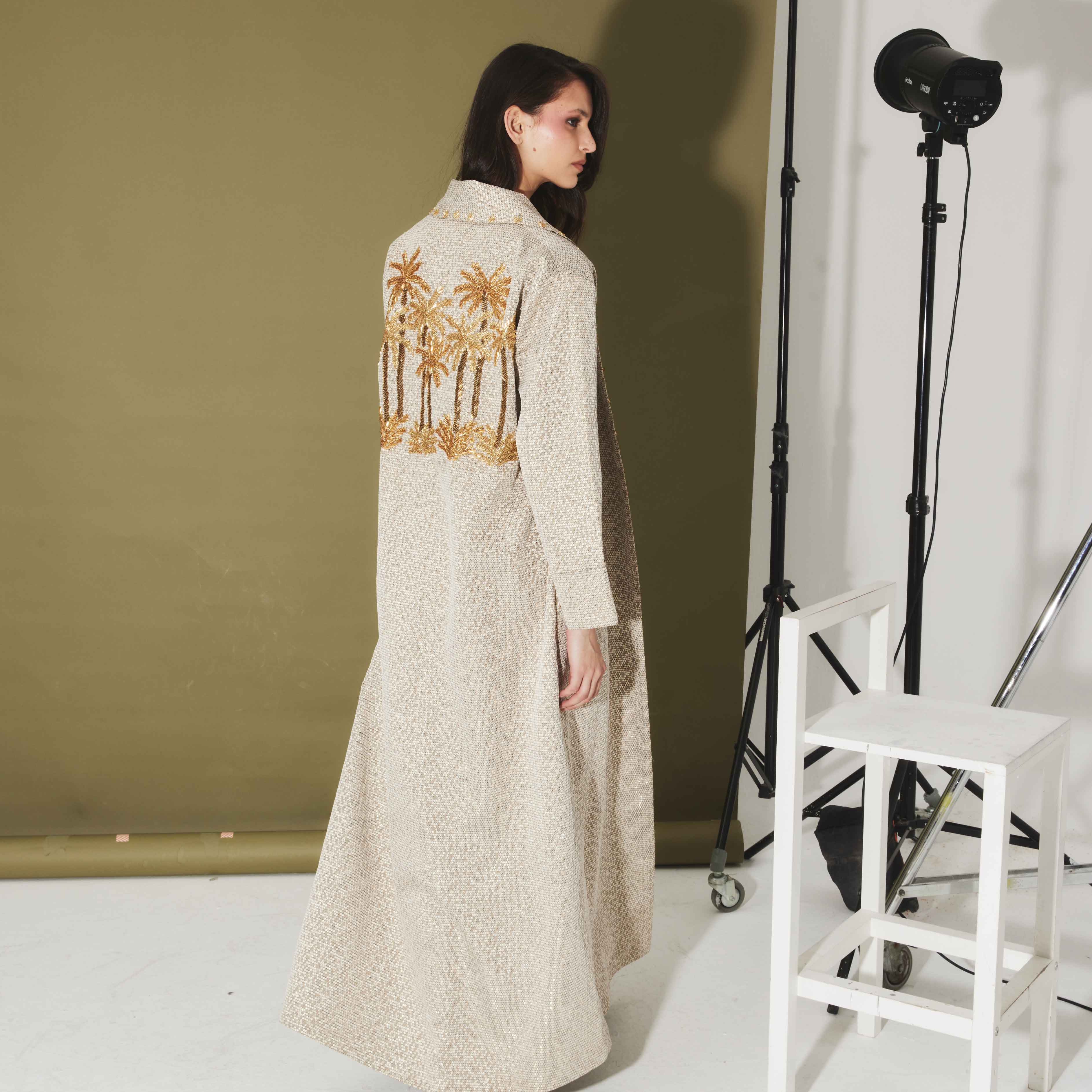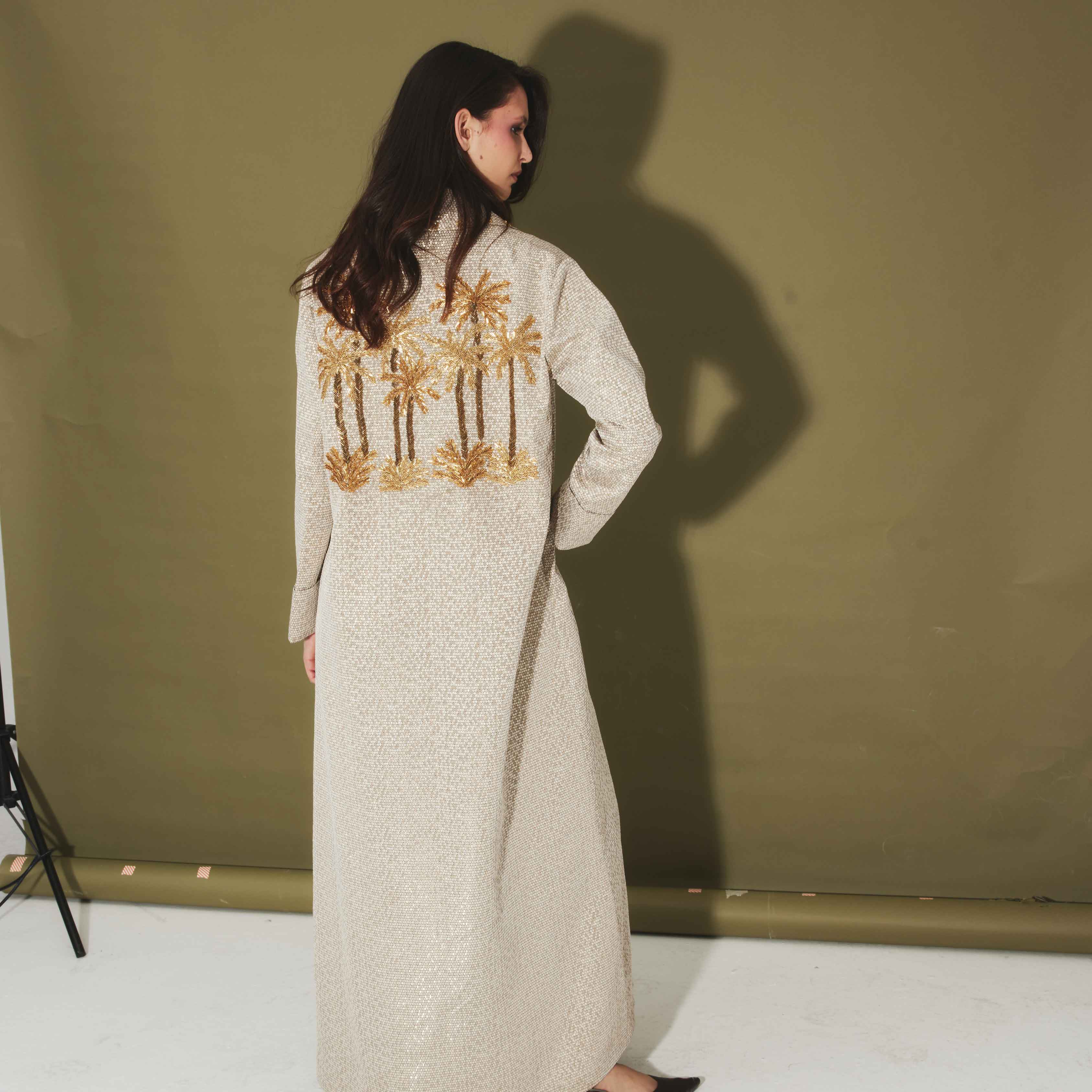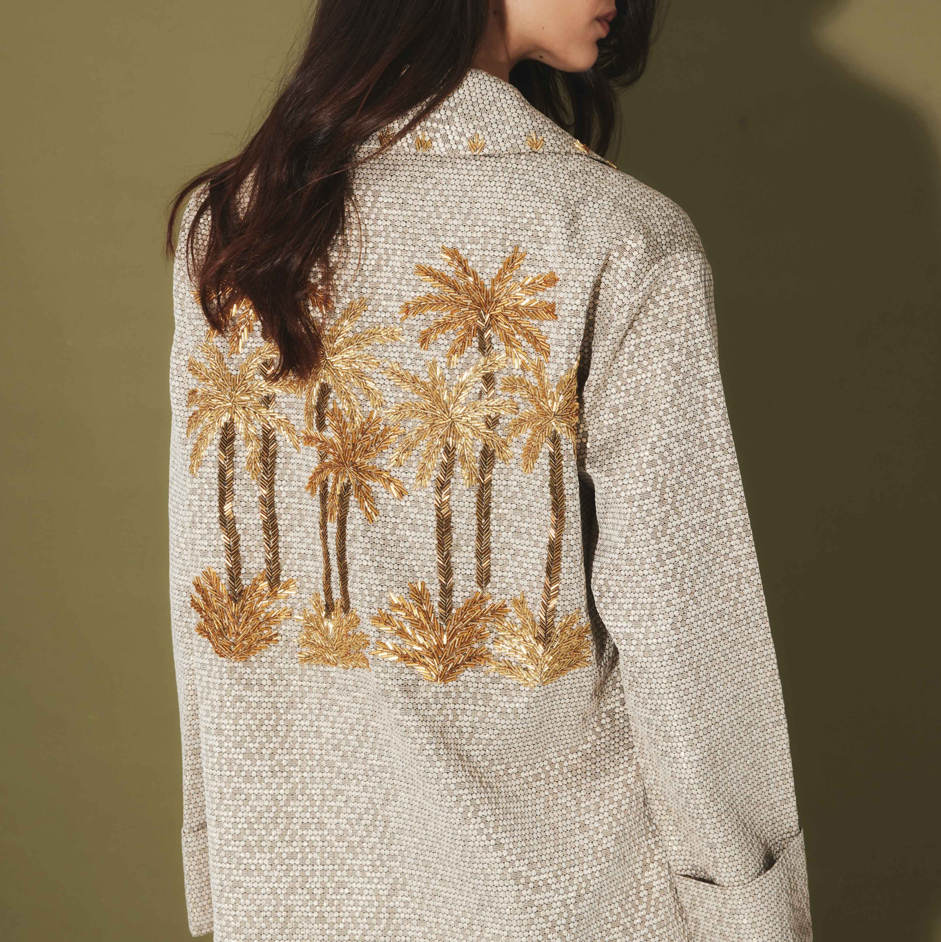 The Oasis Honeycomb Cover Up offers a contemporary take on statement dressing with its structured yet fluid silhouette. Designed from a silver-tinted honeycomb fabric has a sleek and flattering fit. The pièce de résistance is the intricately hand-beaded golden palm tree motif glittering across the back, adding a touch of opulence to this minimalist piece. With it's softly tailored fit, this full-length cover-up is the perfect layering piece for special occasions.